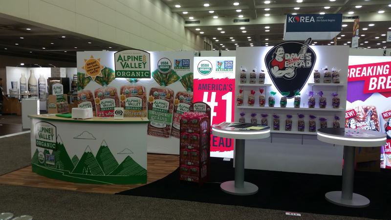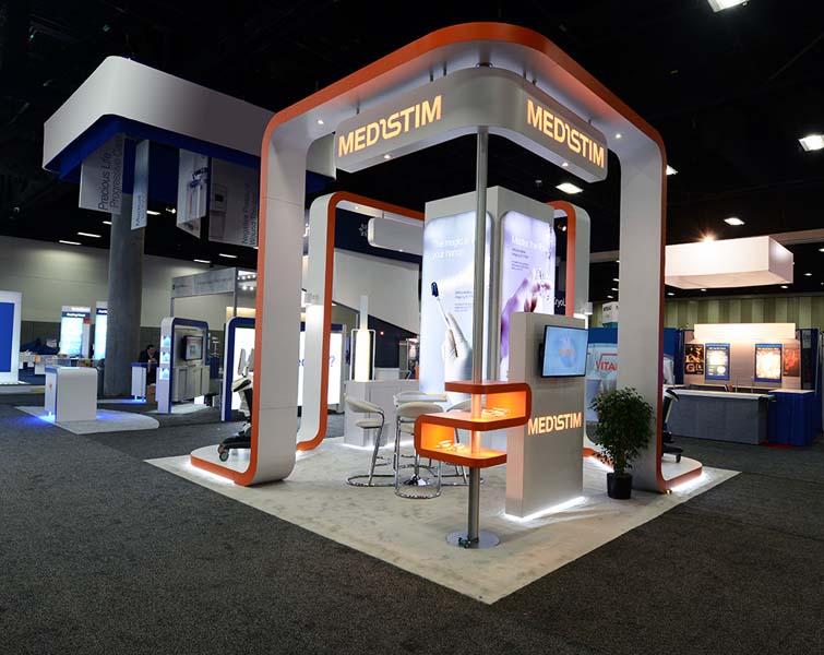 The Custom Exhibit Gallery includes islands, inlines, product displays, and counters. The designs illustrate the latest trends in lightboxes, wood fabrication, slatwall, counters, and hybrid exhibits. Most using direct print, tension fabric, and vinyl graphics to achieve a distinctive appearance.