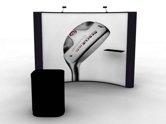 The rental exhibits gallery includes a variety of workstations with locking doors for storage, product shelves, and monitors. The arch-shape and flat canopies add an attractive design element to many rental design options. Most of the inline rental exhibits pack and ship in one crate and are easy to set up. For your peace of mind, we stage and photograph every exhibit before shipping to ensure your graphics look great and fit perfectly.
