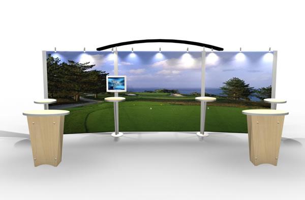 The rental exhibits gallery includes a variety of workstations with locking doors for storage, product shelves, and monitors. The arch-shape and flat canopies add an attractive design element to many rental design options. Most of the inline rental exhibits pack and ship in one crate and are easy to set up. For your peace of mind, we stage and photograph every exhibit before shipping to ensure your graphics look great and fit perfectly.