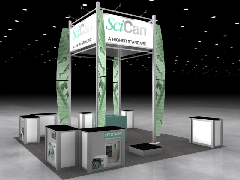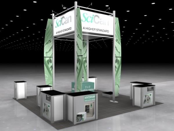 The Rental Island Exhibits go way beyond a pretty picture. We've incorporated key features such as large graphics, private and semi-private conference rooms, towers with locking storage access, and workstations and reception counters with secure storage. Not enough? Then add product shelves, large and small monitors for presentations, a variety of light fixtures, and hanging signs for high visibility from anywhere on the show floor. We also offer three contemporary double-deck configurations.