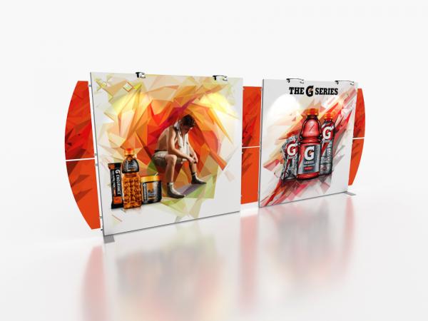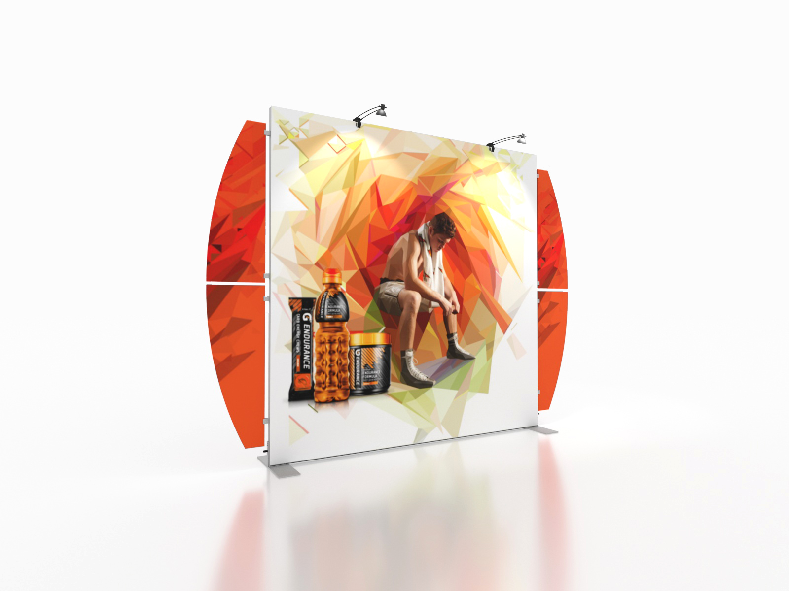 Graphics: Primarily one large tension fabric graphic @ 7.5 ft x 6.75 ft with a smaller tension fabric graphic and/or direct print graphics. Velcro tension fabric connections.