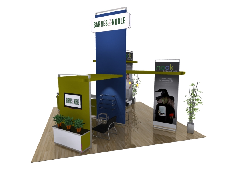 With over 425 square feet of "in your face" graphic space the VK-5075 will make your message obvious and your booth the envy of the show floor. Slim towers launch themselves from the floor in three different heights. 16', 12', and 8'. Ceilings reminiscent of Frank Lloyd Wright seem to mysteriously float above the functional floor space below.