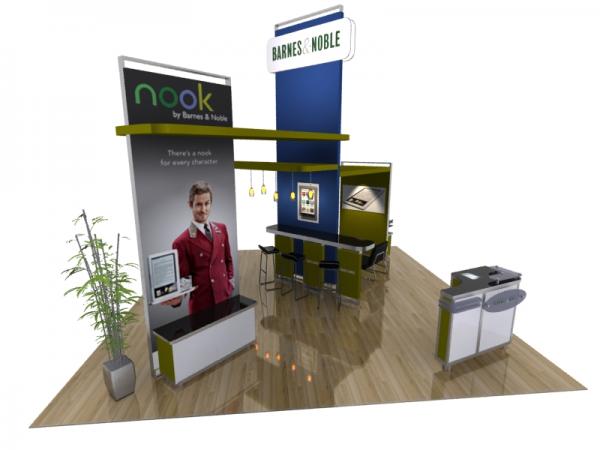 Pendent lights gracefully hang about the semi private bar where you and your client will "seal the deal". Plenty of storage to keep booth clutter to a minimum. The island includs (4) product shelves, monitor presentation wall, and reception counter with storage. Rock the show with the sophisticated force that is the VK-5075.