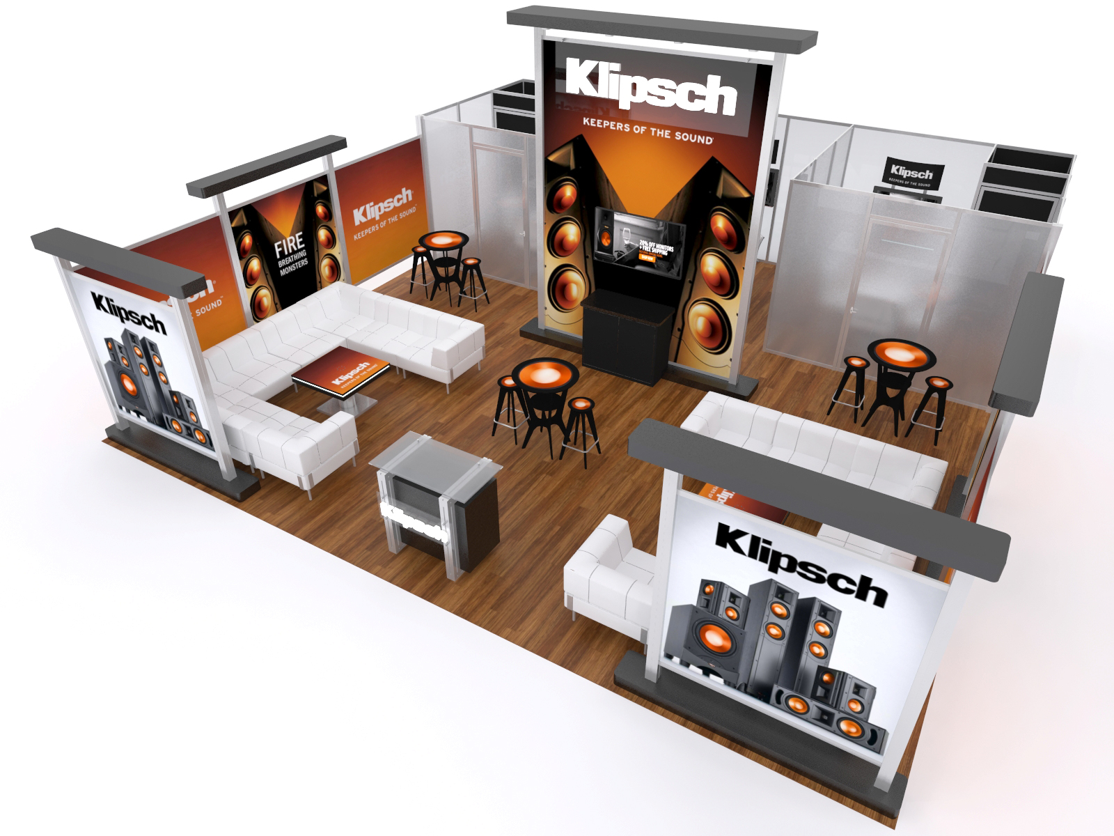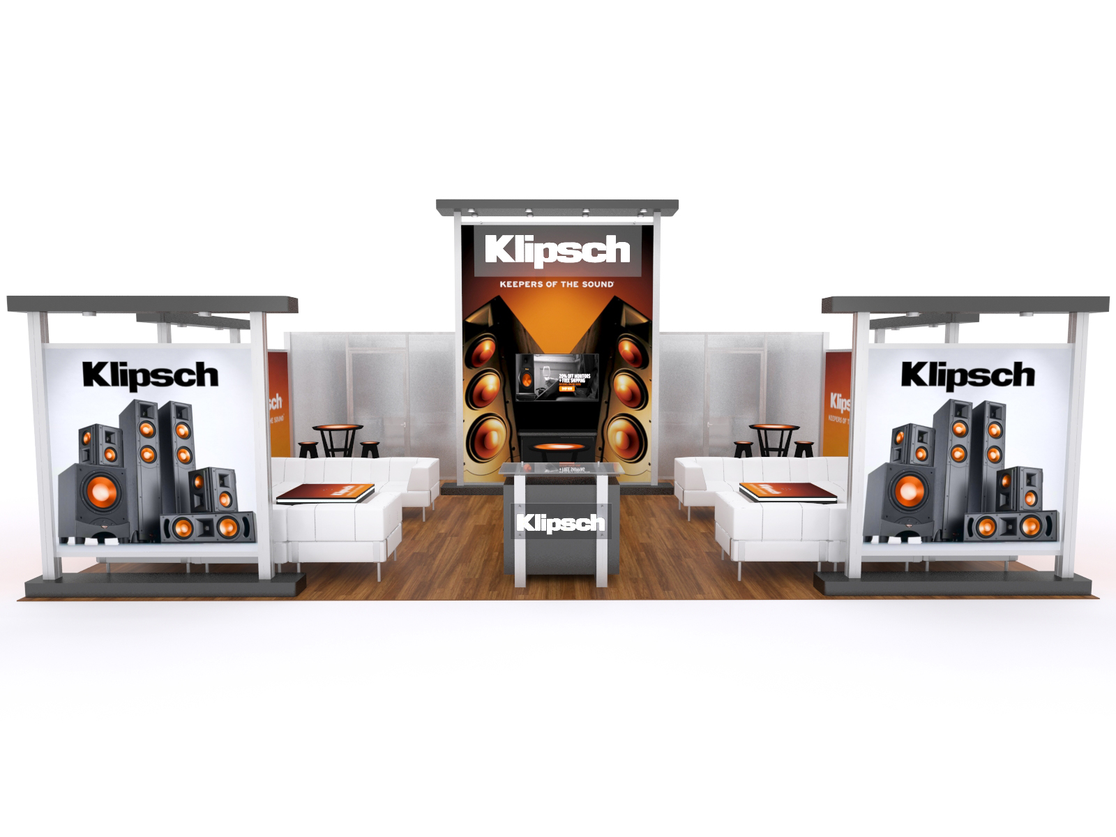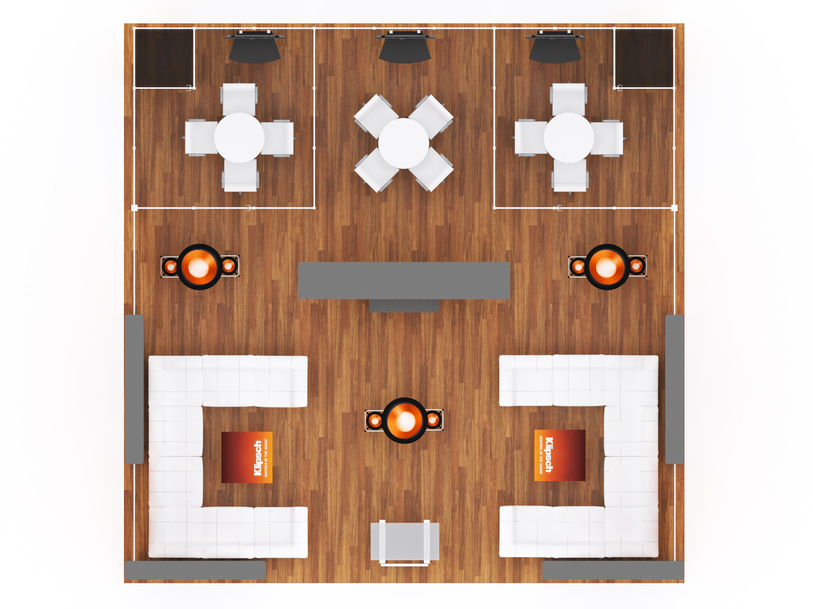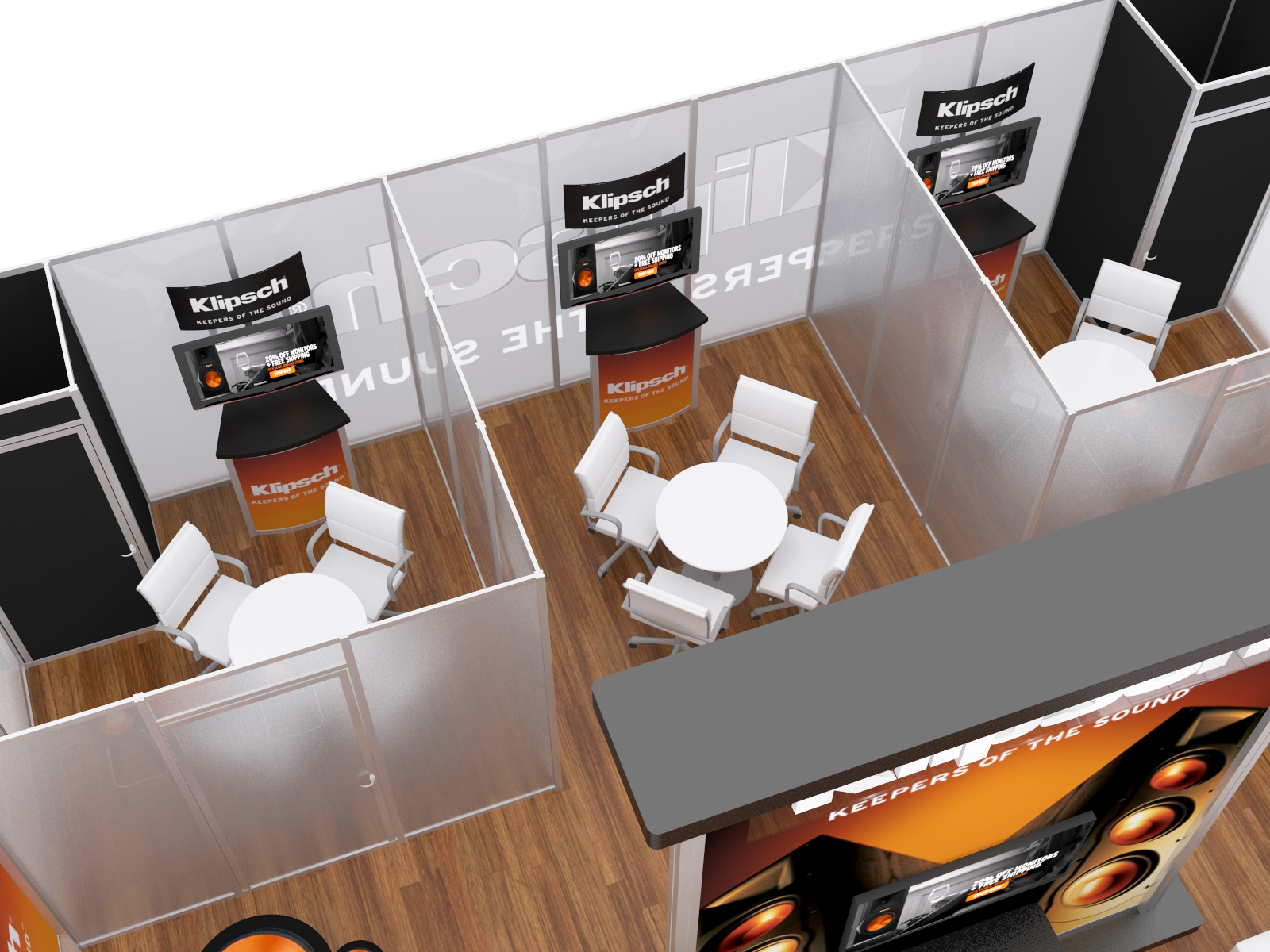 The VK-5079 is all about business. No fluff. No pretense. But that doesn't mean that business has to be formal or your message secondary. The VK-5079 projects a powerful graphical message, surrounded by functional meeting spaces. The 30 x 30 island includes an upscale reception counter. There are two casual lounges and three sets of tables and chairs. Each casual lounge has a large coffee table charging station for smartphones or tablets. The semi-formal meeting rooms each have a monitor stand with storage. In addition there are two closets with full-size doors. There's even a 12 ft. tower with a central monitor with a counter for storage.
