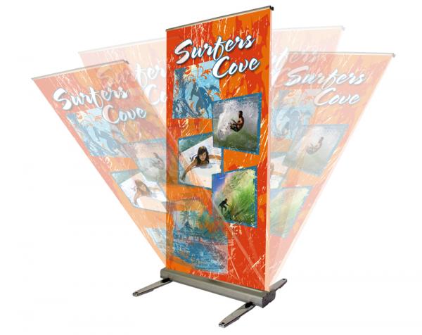 Why spend good money on a banner stand and then put a low-end graphic on it? Vinyl graphics are fine for some uses, especially long-term outdoor situations (such as an outdoor pole-mounted application), but they are usually not the highest quality. Even if the printing is top-notch, a vinyl banner has a tendency to curl. In contrast, a fabric banner will hold its shape even under tension.