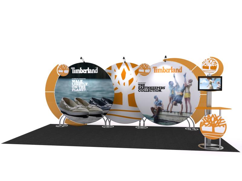 Whatever design you choose for your next trade show exhibit make sure it reflects your organization's overall vibe. The TF series has two distinct advantages. First, the round display design makes a strong visual statement. It's unmistakable on any show floor. Second, the assembly is decidedly casual with push-button connectors for the large center ring. The larger graphics are tension fabric pillowcases with zippers. Nothing could be easier. There's even a standoff graphic for additional branding and a curved pedestal with locking storage.