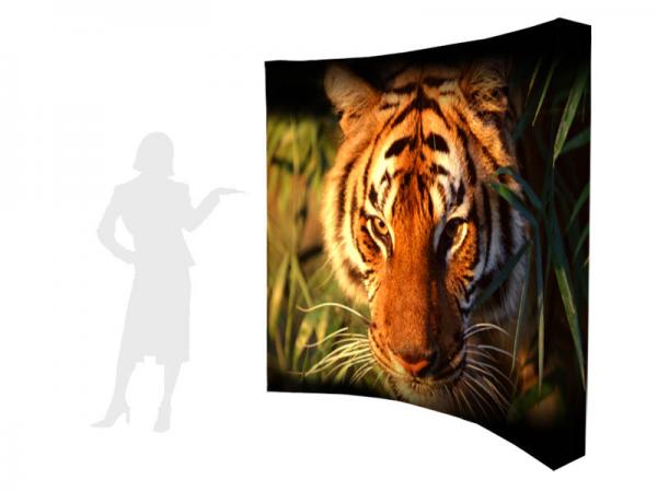 Available as either a flat or curved display in a variety of sizes from 5 ft x 5 ft table tops to enormous 12 ft x 7 ft standing displays! The fabric graphics eliminate any glare making them ideal for media backwalls. Every VBurst comes with a nylon carrying bag and adjustable feet.