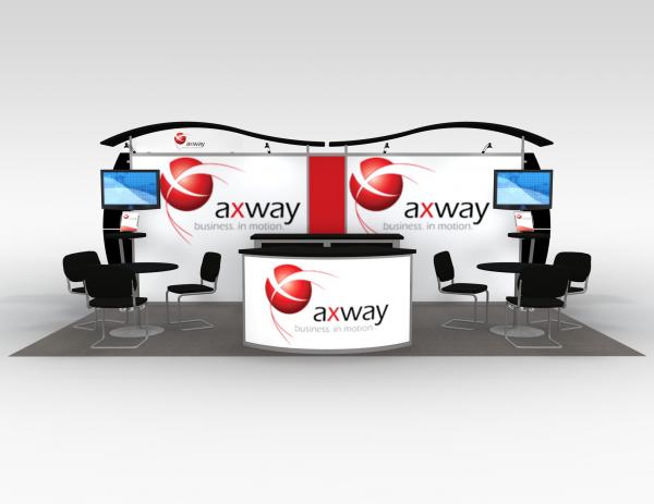 The rental exhibits gallery includes a variety of workstations with locking doors for storage, product shelves, and monitors. The arch-shape and flat canopies add an attractive design element to many rental design options. Most of the inline rental exhibits pack and ship in one crate and are easy to set up. For your peace of mind, we stage and photograph every exhibit before shipping to ensure your graphics look great and fit perfectly.