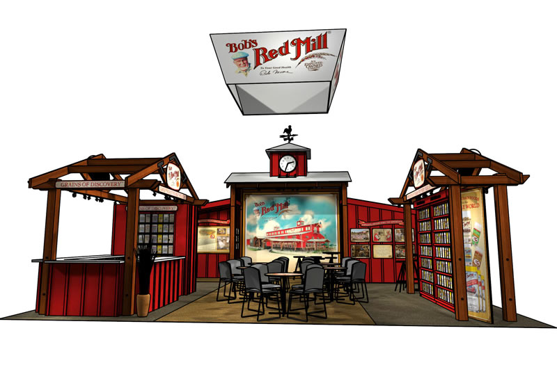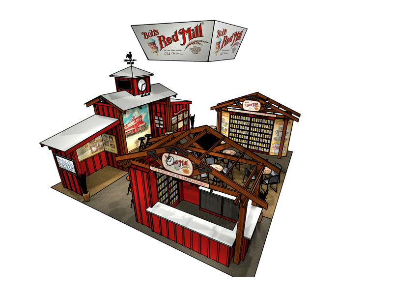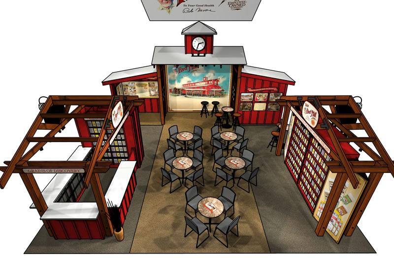 A third structure is a sampling station with counters, shelf storage, and an area for staff to offer products to attendees. The back of the sampling area has another small storage section with an inset 4-foot shelf. Each structure’s design features 6” x 6” wooden beams with overhead trusses that hold up the mill-like roof. A red cupola tops the main structure with large clocks facing front and back.