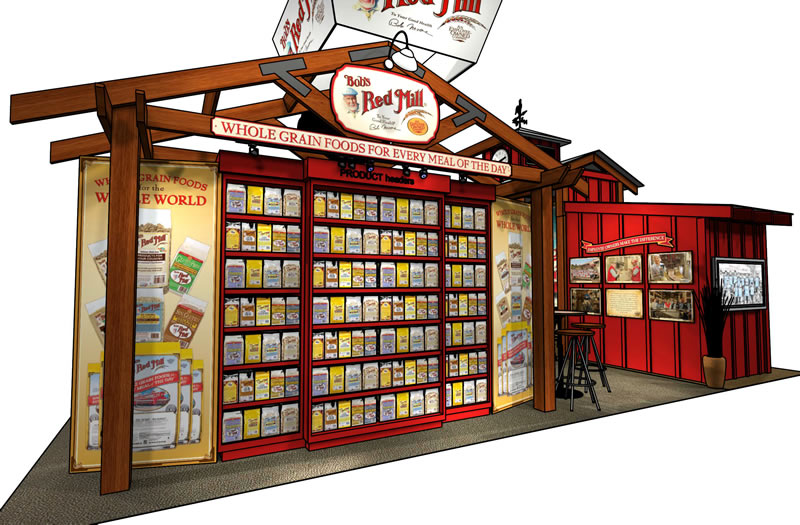 DM-1000 Trade Show Exhibit -- Image 1The custom DM-100 consists of three main structures. The biggest has a 12’ x 12’ backlit fabric graphic that dominates the structure. On either side of the 12 x 12 graphic are informational alcoves. The opposite side contains another informational alcove and walk-in store with extensive shelves. The second structure is for product displays, featuring four 4-foot sections, much like a retailer would see in a store. End caps are hanging fabric banners.