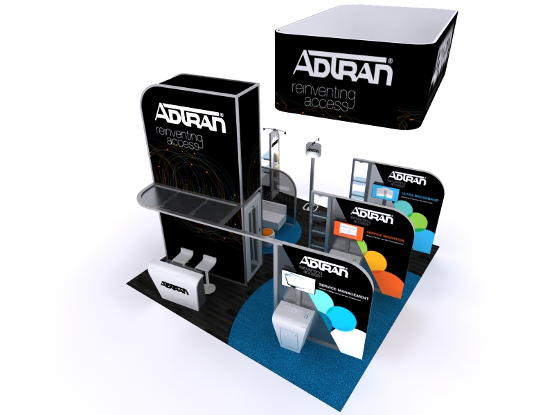 There's something unmistakably alluring about a Custom Hybrid Exhibit. The DM-1050 and DM-1051 demonstrate how an effective and practical trade show exhibit can also be a beautiful representation of your branding. These islands include custom reception counter and workstation(s), all with lockable storage. The backwall graphics for the workstations are backlit using brilliant SuperNova LED Technology. There are even product shelves, walk-in storage, and a media wall. The same components can be used for a 10 ft., 20 ft., and 30 ft. inline.
