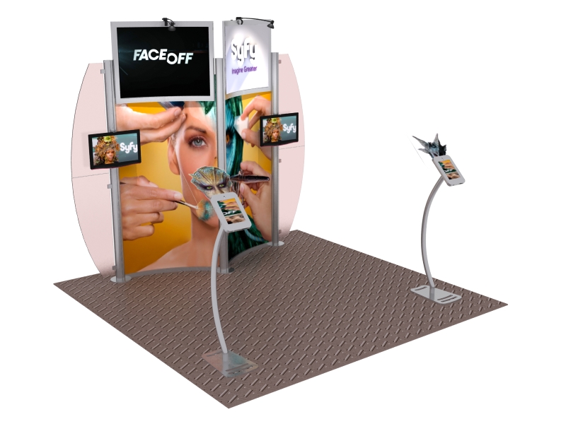 VK-1325 Trade Show Exhibit -- Image 1The VK-1325, VK-2927, and VK-3002 are designed to be adaptable, show to show, year after year. Start with the 10 ft. version, then expand into the 20 ft and 30 ft. displays. The engineered aluminum frame makes them sturdy and versatile, and the large tension fabric graphics means you're message will be seen. All include at least two MOD-1312 iPad stands and backwall workstations. The larger versions have a presentation or demo area with a larger monitor. With a Visionary Designs display, you can achieve whatever you want – no limitations . . . but at a price thousands of dollars less than a custom exhibit.