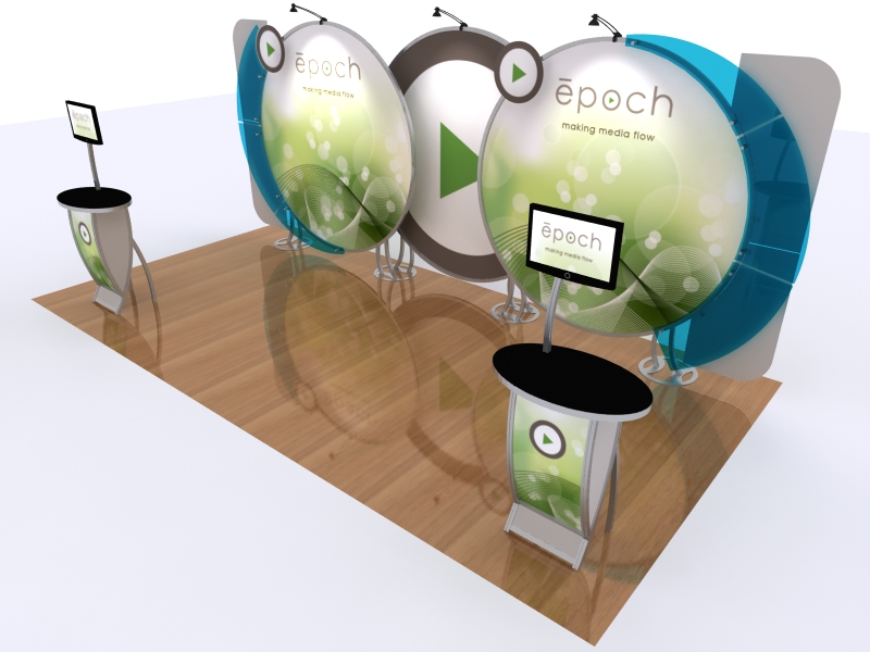 If 50 is the new 30, then circles and curves are the new squares and rectangles. Here's the bottom line: You go to a trade show to be seen, so be seen with an exhibit that elicits "Oohs and Aahs." The VK-1320 and VK-2919 do more than communicate your message with bold tension fabric graphics and colorful accent wings. They have a power and presence to stop an attendee in the aisle. That's what you want from a trade show display. Both reconfigurable 10 ft. and 20 ft. versions come with the VK-1605 workstation, which is perfect for an A/V demo or just guiding a potential client through your website.