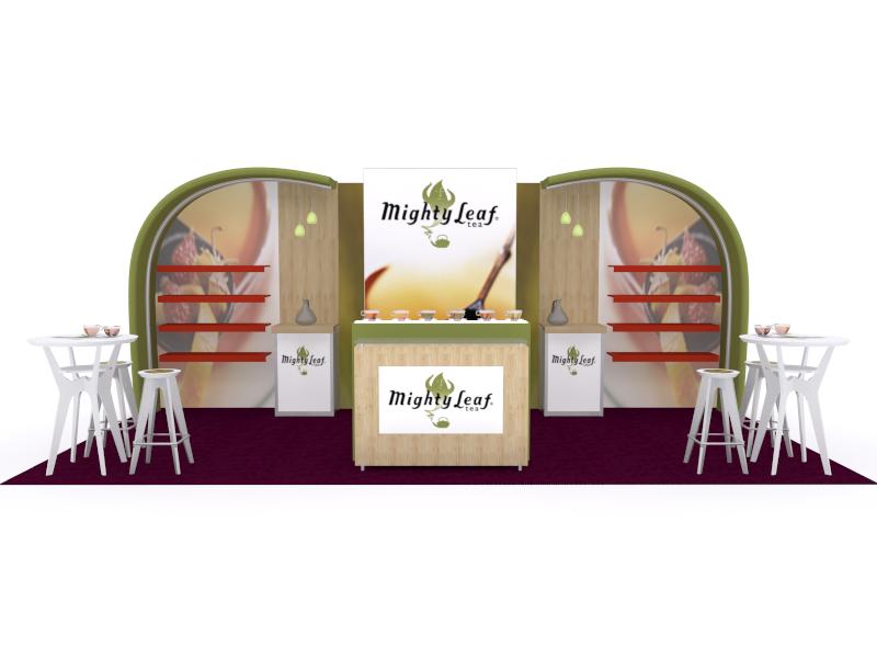 A well-design trade show exhibit reflect the style, the personality, and the purpose of the exhibitor. The modular VK-2961 inline and VK-5114 island may be just the cup of tea for the right company. There's a custom reception counter with uplighting and storage, seating areas, large graphics, and ample shelving and storage. The curved Aero fabric "bookends" create a soft, flowing appearance that guide the eye to the products and to the main graphic. Need more? Don't be shy about adding monitors, iPad kiosks, or additional counter or storage. The adaptable design makes it easy to reconfigure it to your vision.