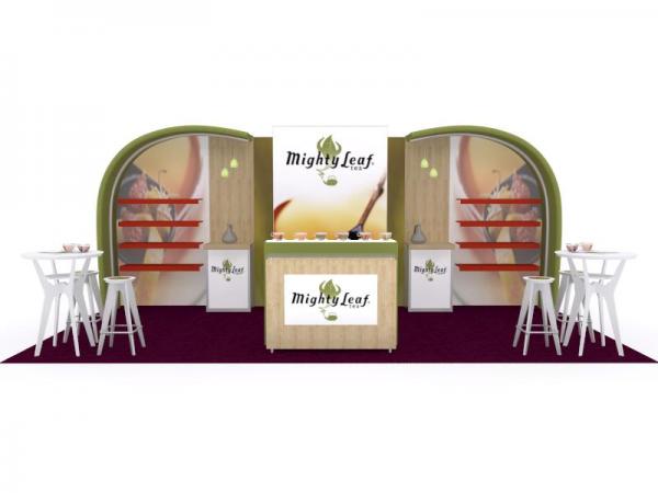 A well-design trade show exhibit reflect the style, the personality, and the purpose of the exhibitor. The modular VK-2961 inline and VK-5114 island may be just the cup of tea for the right company. There's a custom reception counter with uplighting and storage, seating areas, large graphics, and ample shelving and storage. The curved Aero fabric "bookends" create a soft, flowing appearance that guide the eye to the products and to the main graphic. Need more? Don't be shy about adding monitors, iPad kiosks, or additional counter or storage. The adaptable design makes it easy to reconfigure it to your vision.