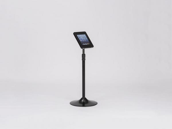 MOD-1365 Portable Telescoping iPad Kiosk -- Image 2It's never been easier to transport a portable iPad Kiosk with so many features. The affordable RE-1242 iPad Kiosk telescopes from 37" to 70". The anti-theft iPad clamshell tilts up to 90 degrees and rotates 360 degrees. The clamshell can be mounted in either portrait or landscape mode. It even has access holes for wire/cord management. The iPad Stand conveniently packs in a rolling suitcase with secure foam inserts for protection.