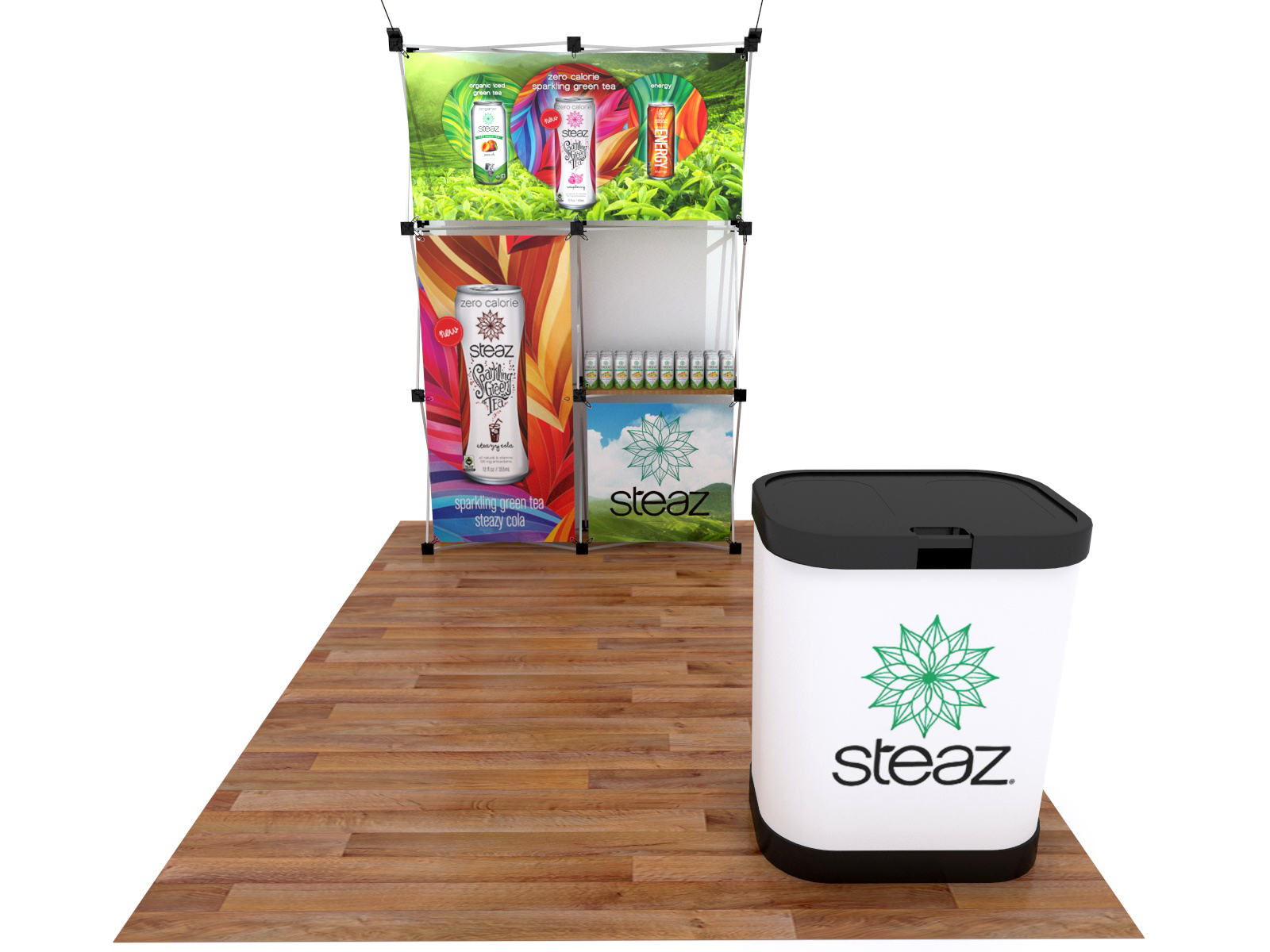 The Quadro Floating Graphic System (FGS) combines convenience and graphic pizzazz into an affordable, portable display. The Quadro frame expands in seconds, and the graphics attach easily with flexible rings. Need to change a graphic for a new product or marketing campaign? No problem. The individual panels make switching graphics quick and cost-effective. Elevate your presentation even more with a stylish printed lycra case wrap, instantly turning storage into a counter. Add lights and a backwall shelf for even more impact. The entire display assembles quickly, and disassembles even faster for a quick exit.