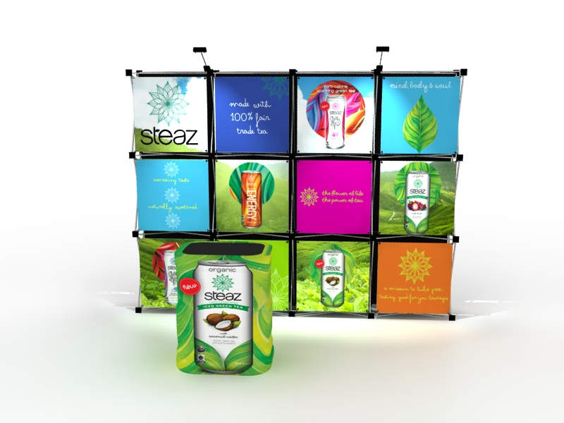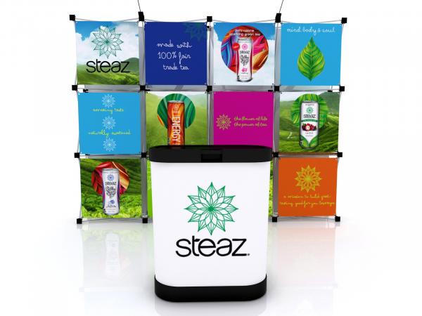 The Quadro Floating Graphic System (FGS) combines convenience and graphic pizzazz into an affordable, portable display. The Quadro frame expands in seconds, and the graphics attach easily with flexible rings. Need to change a graphic for a new product or marketing campaign? No problem. The individual panels make switching graphics quick and cost-effective. Elevate your presentation even more with a stylish printed lycra case wrap, instantly turning storage into a counter. Add lights and a backwall shelf for even more impact. The entire display assembles quickly, and disassembles even faster for a quick exit.