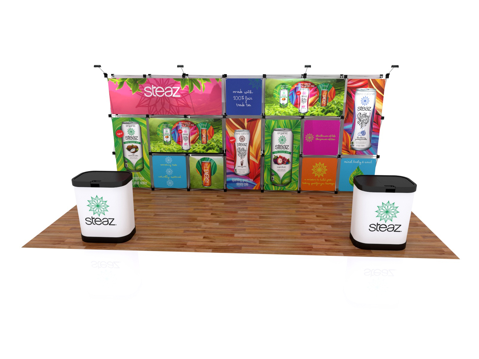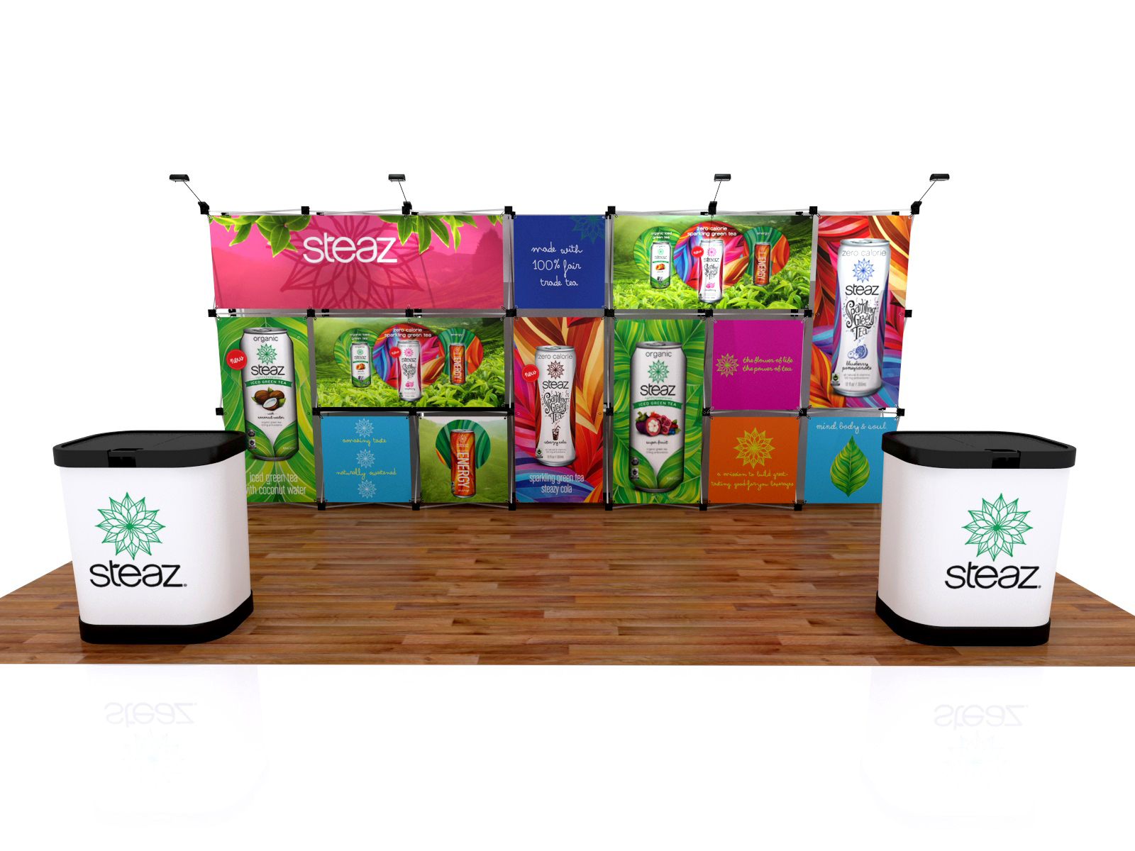 1. The versatile Quadro S pop up is designed to perform flawlessly under any trade show schedule and can be configured with shadowboxes, shelves, multiple monitors, waterfall brackets, and much, much more. There are nearly 90 kit designs available in 10 ft., 20 ft., and table top configurations.