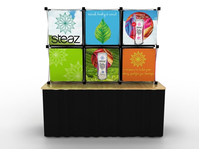 The Quadro Floating Graphic System (FGS) combines convenience and graphic pizzazz into an affordable, portable display. The Quadro frame expands in seconds, and the graphics attach easily with flexible rings. Need to change a graphic for a new product or marketing campaign? No problem. The individual panels make switching graphics quick and cost-effective. Elevate your presentation even more with a stylish printed lycra case wrap, instantly turning storage into a counter. Add lights and a backwall shelf for even more impact. The entire display assembles quickly, and disassembles even faster for a quick exit.