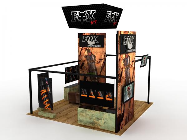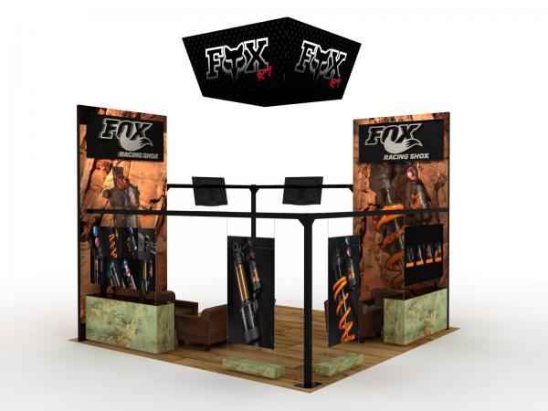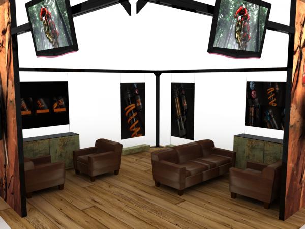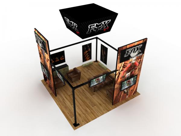 For many exhibitors an island display should achieve two goals: communicate the brand and welcome attendees into the booth. The VK-5136 design does that to a "T." The large graphics come in three flavors. There are two double-sided 16 ft. towers with fabric graphics. Next, four direct print graphics are suspended in the booth space (consider custom lenticular graphics for the Wow! effect at an additional charge). Finally, there's the draw from across the hall -- a large tapered square hanging sign. Of course, there's the "can't miss" monitors for your videos with two positioned on the crossbeams. Once inside the booth, your guests can relax since there's ample room for furniture, whether you chose lounge chairs or tables and chairs.