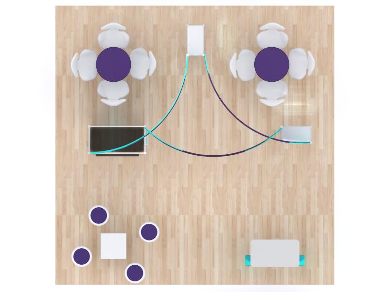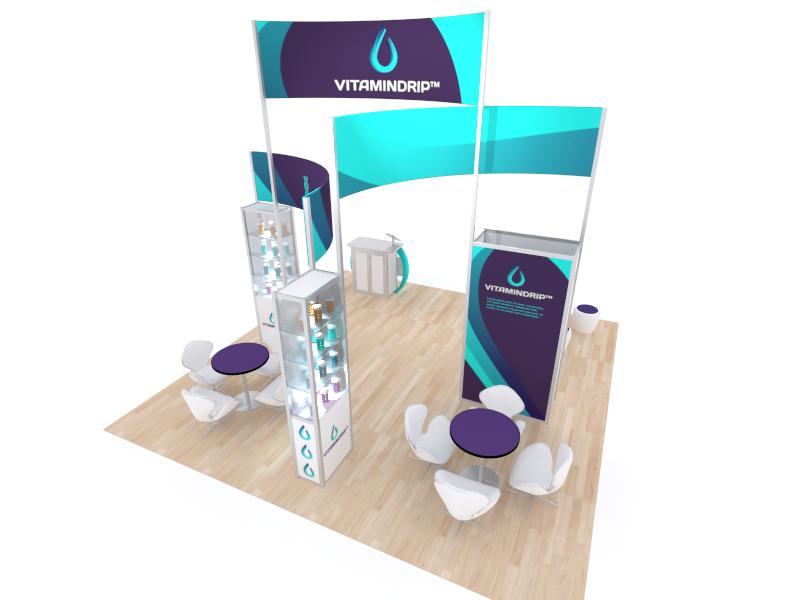 Exhibitors often use the phrase "Open and Airy" when looking for a new island or inline design. It suggests an open, comfortable floorplan which still fulfills the primary goals of promoting the brand and meeting with show attendees. The VK-5137 and VK-2975 both achieve those goals. The island has three large double-sided graphic headers with the tallest at 16 feet. There's a walk-in closet for storage, which does double duty as monitor and literature walls. The MOD-1550 Reception Counter creates a targeted spot for attendees to start their tour of the exhibit space. Once inside the booth, your guests can relax since there's ample room for furniture, whether you choose lounge chairs or tables and chairs.