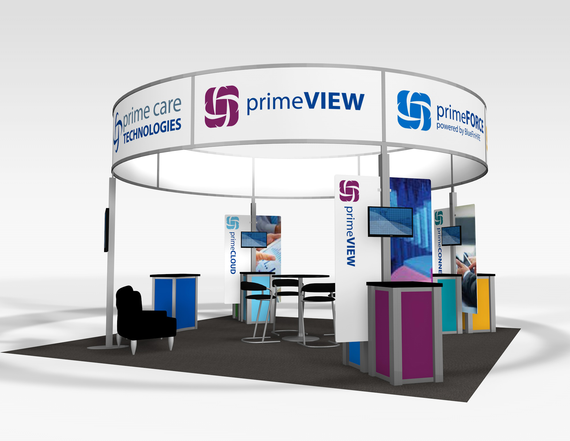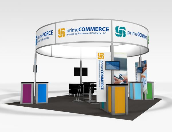 The Rental Island Exhibits go way beyond a pretty picture. We've incorporated key features such as large graphics, private and semi-private conference rooms, towers with locking storage access, and workstations and reception counters with secure storage. Not enough? Then add product shelves, large and small monitors for presentations, a variety of light fixtures, and hanging signs for high visibility from anywhere on the show floor. We also offer three contemporary double-deck configurations.