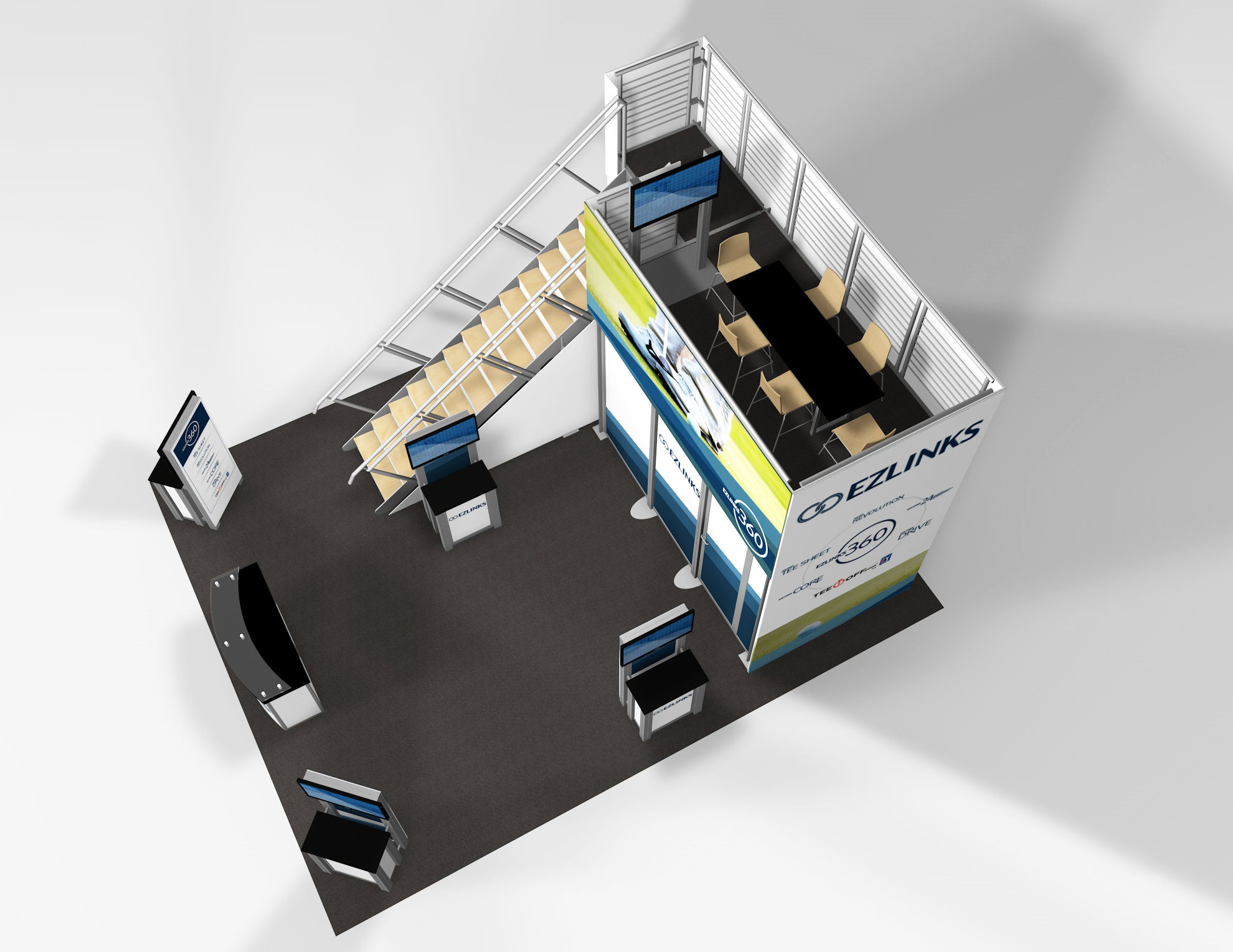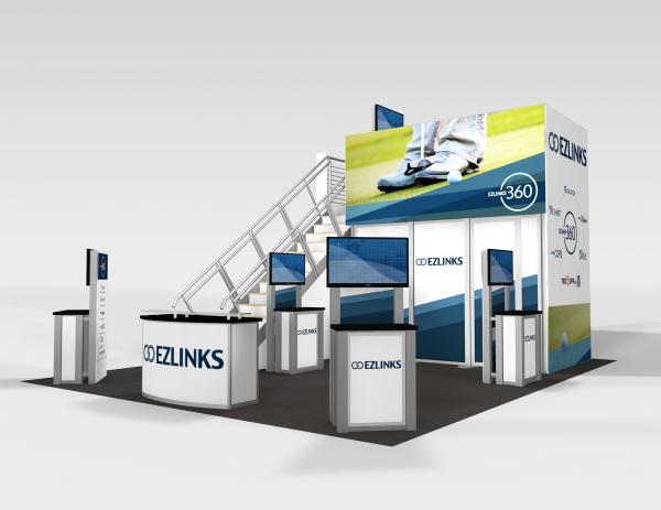 RE-9073 Ezlinks Trade Show Rental Exhibit -- Image 1The Rental Island Exhibits go way beyond a pretty picture. We've incorporated key features such as large graphics, private and semi-private conference rooms, towers with locking storage access, and workstations and reception counters with secure storage. Not enough? Then add product shelves, large and small monitors for presentations, a variety of light fixtures, and hanging signs for high visibility from anywhere on the show floor. We also offer three contemporary double-deck configurations.