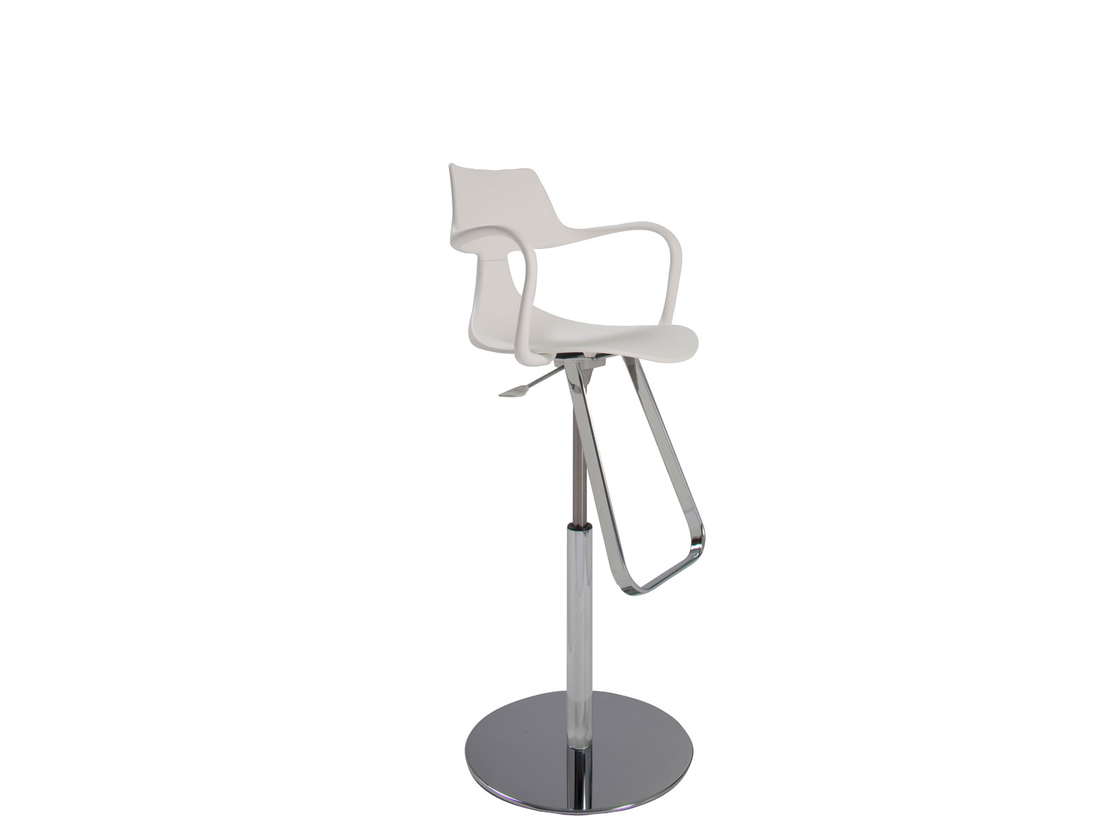 Shark Barstool -- Trade Show Rental FurnitureFunctional high-end Italian designed swivel barstool with white plastic seat/arms and adjustable chrome base (34"-44"H).