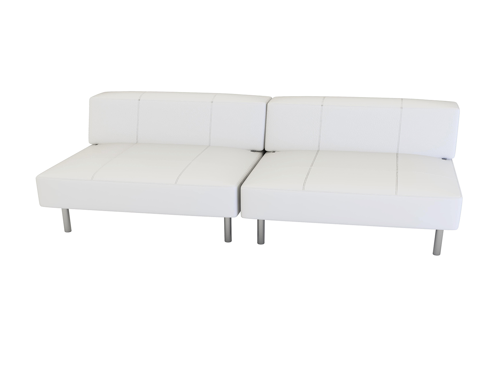Modular white vinyl low back loveseat with chrome legs. Seats up to 3 persons comfortably. Size = Length 68 ", Depth 34.5'' , Height: 27".