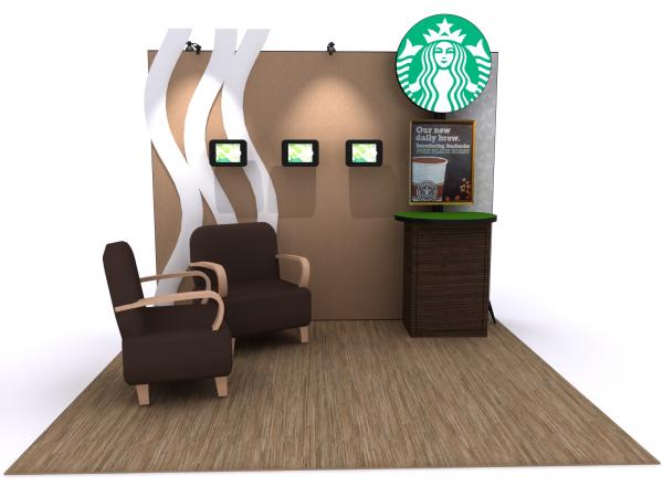 Gravitee designs start with a simple concept -- beautiful displays, simple assembly, and functional components. That's what every exhibitor wants. The GK-1337 is an elegant display with all the features of a custom exhibit, except the price. The full-size panels connect seamlessly. The iPad clamshells add A/V in a small creative space. There's a practical workstation, complete with a dramatic 24" backlit sign and locking storage. Add USB charging ports to the workstation for less than $300. Once inside the booth, your guests can relax since there's ample room for furniture, whether you chose lounge chairs or tables and chairs.