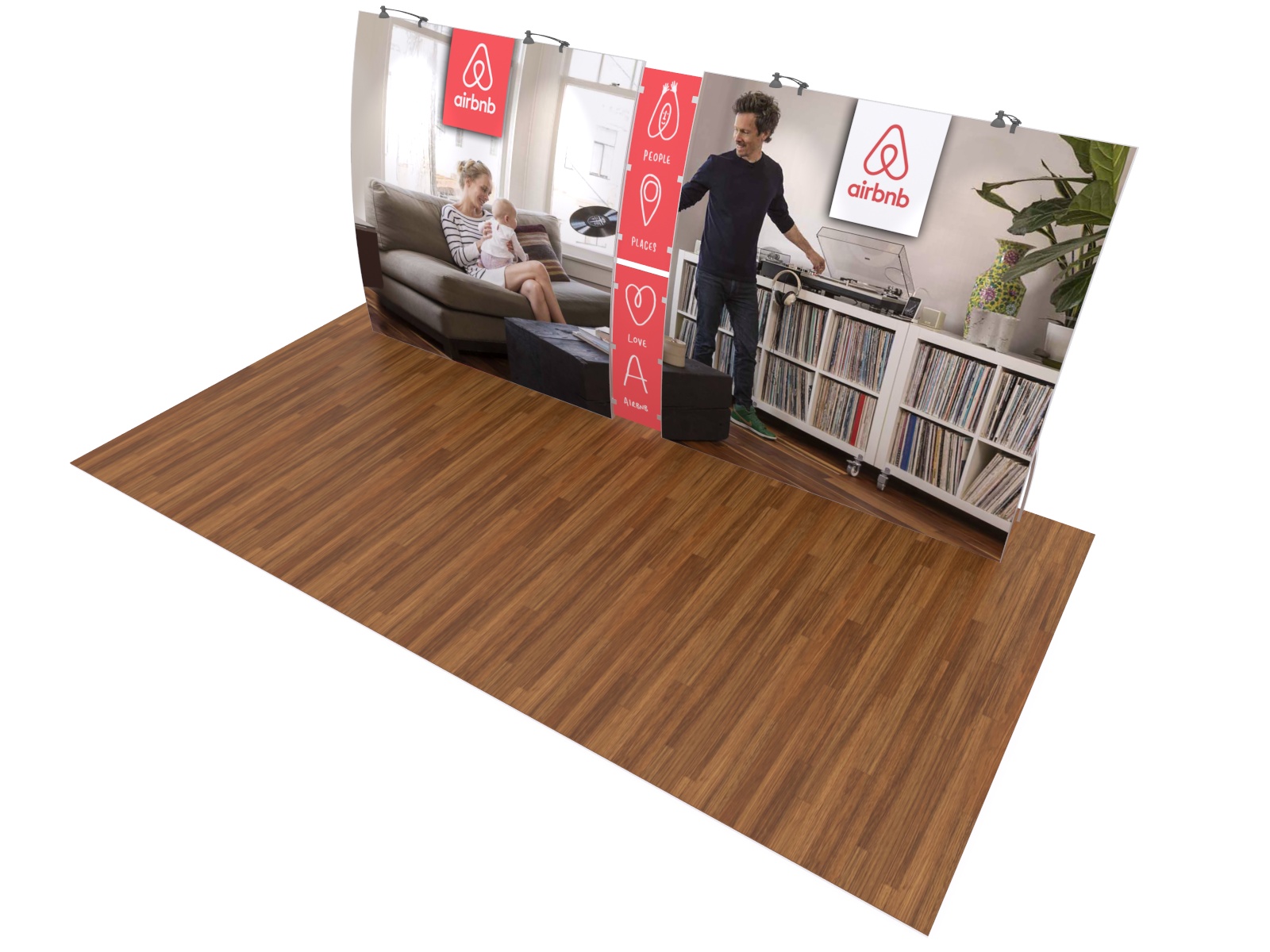 Graphics: Primarily one large tension fabric graphic @ 7.5 ft x 6.75 ft with a smaller tension fabric graphic and/or direct print graphics. Velcro tension fabric connections.
