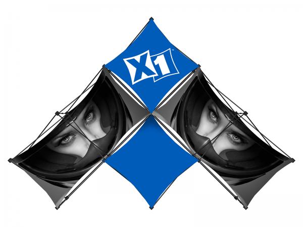 The X1 10ft 6 Quad Pyramid Popup Display is a versatile no tools stretch fabric pop-up display system. Available designs and custom display options bring excitement and flexibility to your exhibit. The X1 is easy to setup, ultra lightweight and portable and even easier to take down. Be off to your next appointment or relaxing while the competition is still sweating through the exhibit break down process. The collapsible pop-up frame uses magnetic connectors with the option of J-hook connectors for more custom or weight bearing displays. Stretch fabric graphics come pre-attached to the frame, and are easily changed out in the field! Kits come with graphics, frame and drawstring carry bag. Kits displayed are our most popular versions. Eight additional frames available plus custom options per request and hundreds of graphic configurations available.