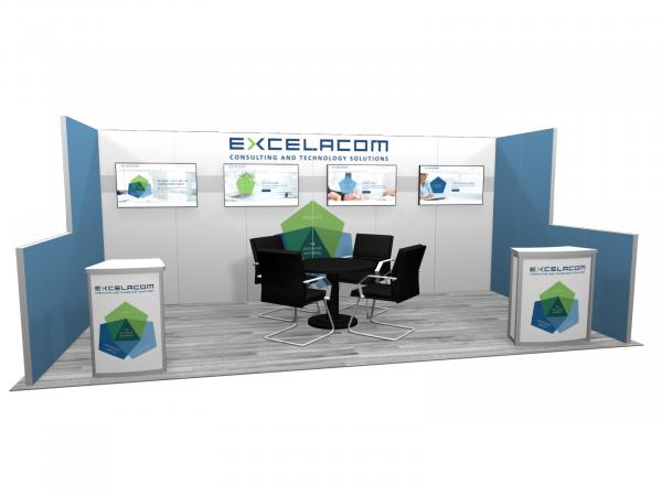 RE-2039 Excelacom - Image 1The rental exhibits gallery includes a variety of workstations with locking doors for storage, product shelves, and monitors. The arch-shape and flat canopies add an attractive design element to many rental design options. Most of the inline rental exhibits pack and ship in one crate and are easy to set up. For your peace of mind, we stage and photograph every exhibit before shipping to ensure your graphics look great and fit perfectly.