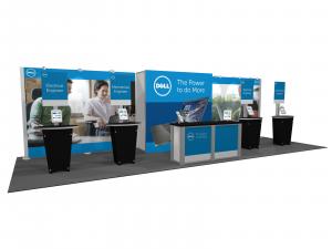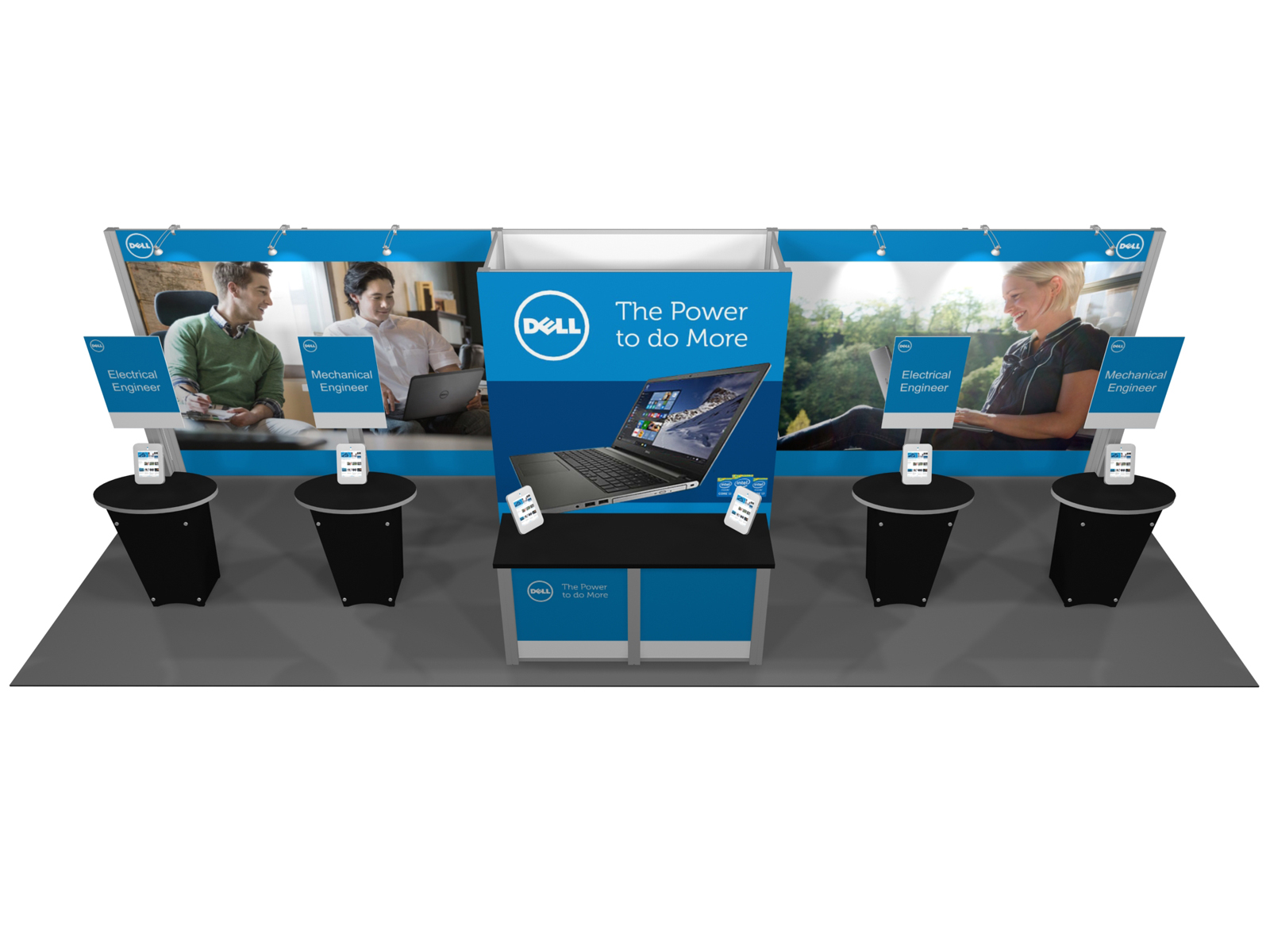 The rental exhibits gallery includes a variety of workstations with locking doors for storage, product shelves, and monitors. The arch-shape and flat canopies add an attractive design element to many rental design options. Most of the inline rental exhibits pack and ship in one crate and are easy to set up. For your peace of mind, we stage and photograph every exhibit before shipping to ensure your graphics look great and fit perfectly.