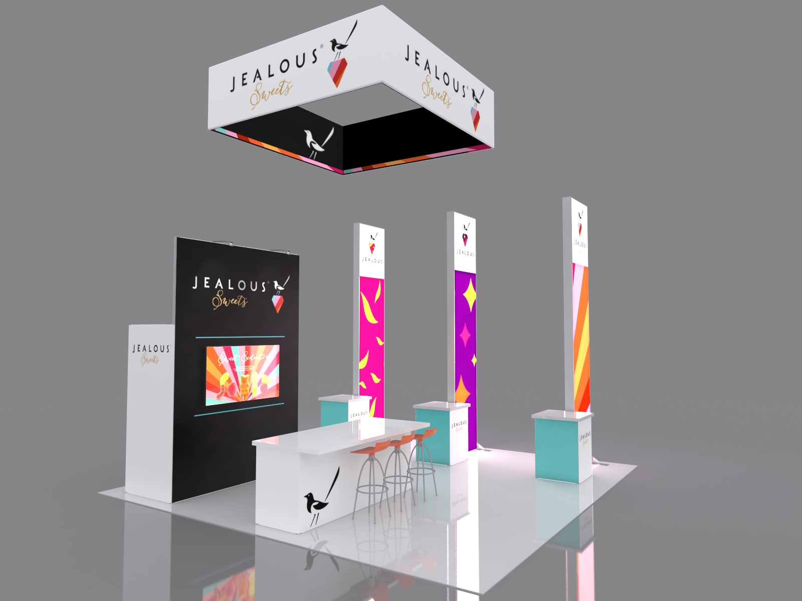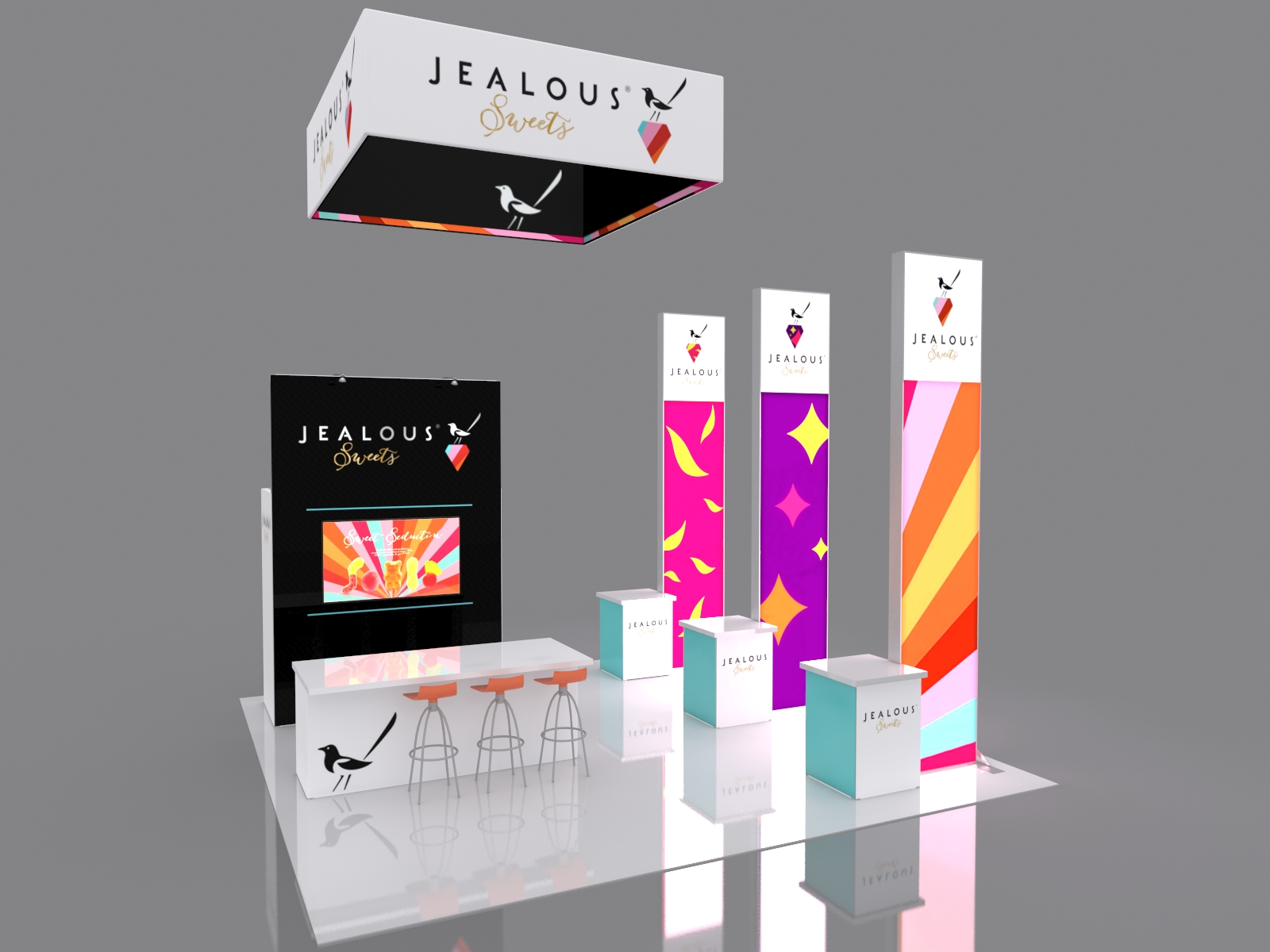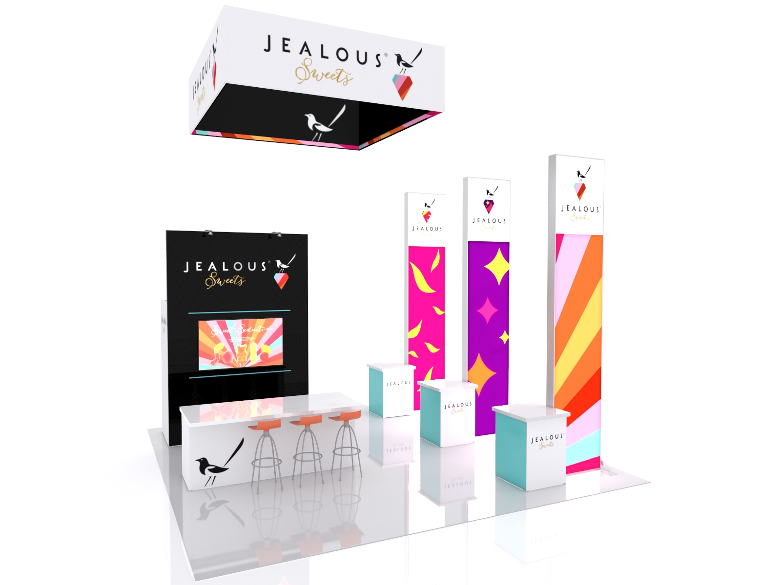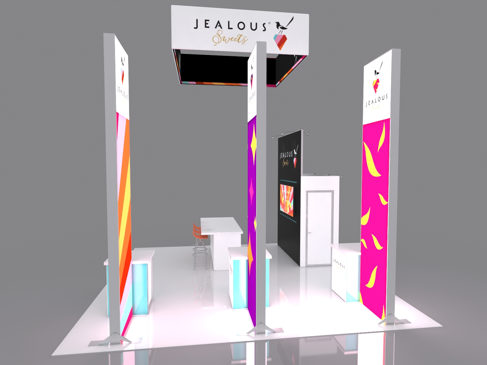 A well-designed trade show island exhibit should be attractive, inviting, informative, and practical. The GK-5152 does all that... and more. It combines a casual bar with functional counters and a large monitor. There are (3) 15 ft. doubled-sided LED Lightboxes, which are sure to attract attention from every angle throughout the exhibit hall. The design includes a large closet with locking storage. Many of the flat panels are from the patented Gravitee System, which connects without tools or loose parts, making assembly much easier than traditional panels. The Large Aero Overhead Hanging Sign pulls it all together with internal and external graphics.