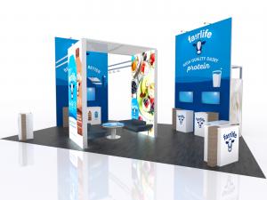 An Island Exhibit should attract attention. The VK-5147 and VK-5148 are designed for maximum exposure at your next show. It all starts with two 12 ft. double-sided SuperNova Lightboxes on either side of a casual meeting space. The meeting space includes a MOD-1430 Charging Station with LED perimeter lights and (8) USB ports. On the aisle, there are small custom reception counters with storage. Beneath the monitors are attractive workstation counters. No island would be complete without closet storage for products, giveaways, coats and briefcases, and cleaning supplies. Anchoring each island design is a 16 ft. double-sided tower with fabric graphics and downlighting.
