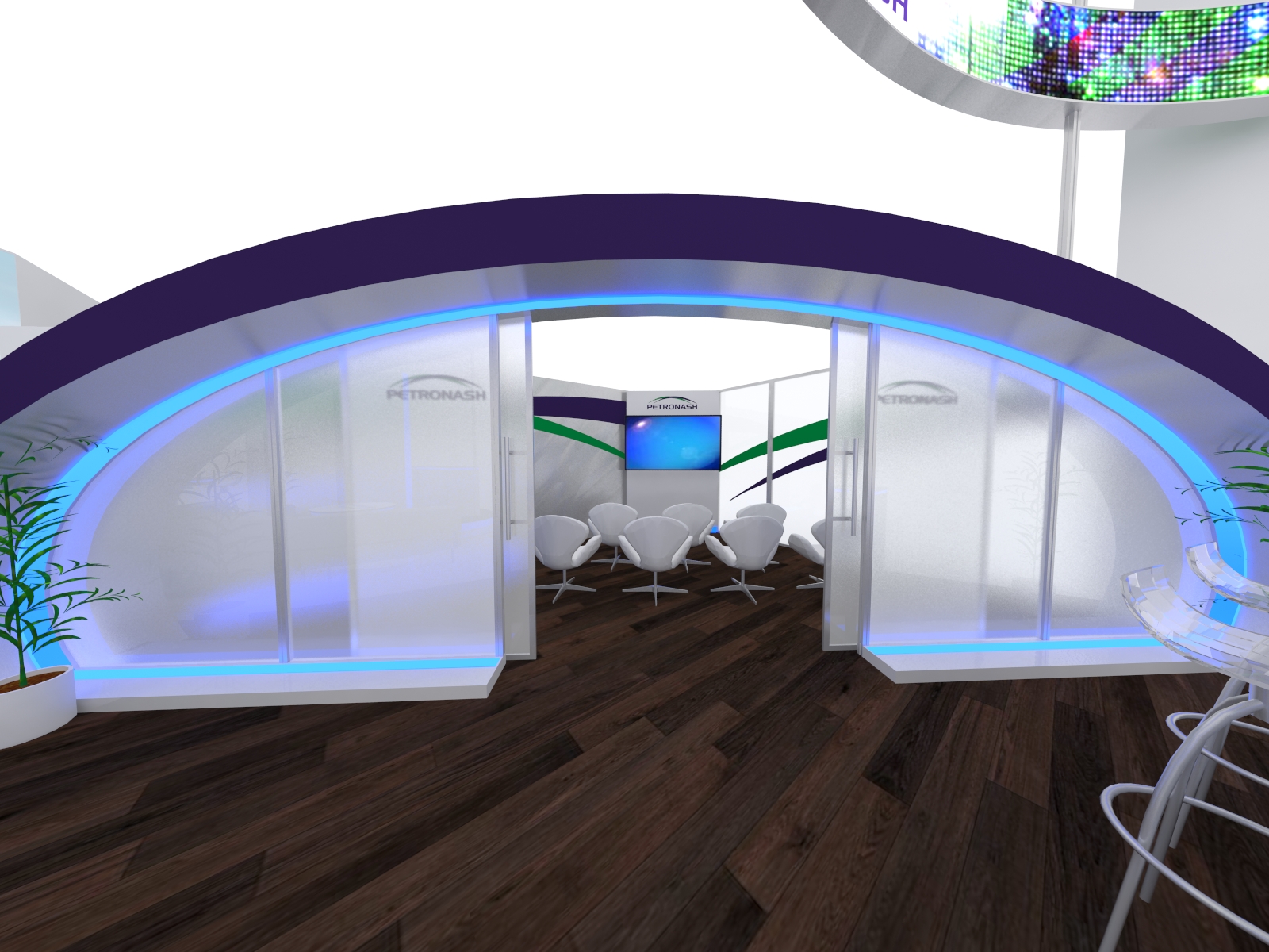 People will talk at your next trade show with the VK-5150 Island Exhibit. There are no compromises with this spacious island exhibit with includes multiple reception counters, meeting rooms, casual lounge areas, and dynamic curves. The main entrance sets the stage with a elegant curved archway into a private presentation area. The presentation area offers seating for a video and ample storage for refreshments, literature, and promotional products. Behind the elegant main reception counter on a raised platform, there's a casual lounge with multiple charging stations. Throughout the island, there are branding opportunities at every height and angle, including a spectacular 40 ft. curved canopy. The VK-5150 assembles in a fraction of the time of a traditional custom island using Gravitee One-Step Modular System for the conference room and perimeter walls.