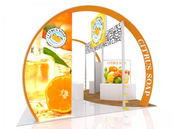 You come to a trade show to get noticed. So get noticed! The VK-5152 incorporates organic curves with bright backlit graphics and functional accessories. It includes three LED lightboxes for can't miss visibility. The two product counters and reception desk include ample locking storage for products, literature, or samples. The semi-private meeting space is ideal for casual conversations with prospective customers. Attendees will appreciate the product display shelves near the aisles and the (3) iPad stands for interactive information about the company and its products or services.