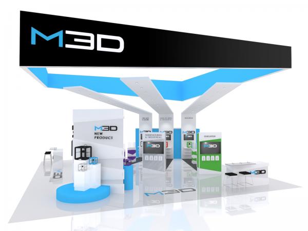 Simply amazing. Beneath the clean lines and stunning overhead graphics, the VK-5153 is a beautiful, function 40 x 40 island with shelving, product displays, meeting spaces, and monitors. There's so much there. Yet this large island doesn't feel crowded, heavy, or cluttered. The design invites attendees to wander through the space and interact with the products and video presentations. There's more than enough room for casual meetings, and the two large closets are ideal for storage. The VK-5153 is the perfect exhibit for exhibitors who believe "showing and telling" are the keys to successful trade show marketing.