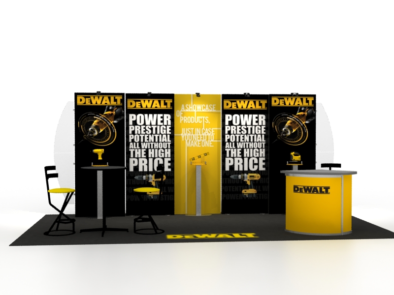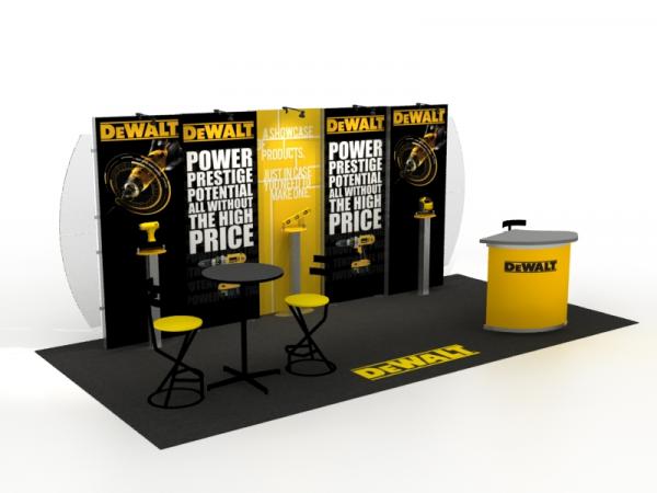 Most exhibitors are obsessive about their marketing message. They strive for a clear, consistent message that differentiates them their competitors on the show floor. To achieve that, it must be bold, succinct and often dramatic. The VK-5040, VK-2970, and VK-1328 series does that . . . and more! The multiple large graphics ensure that visibility it maximized with double-side towers, product displays, and graphic stands. At a glance, you know there's nothing shy about these displays. They're designed for multiple configurations, all using the same graphics. The reception counter has locking storage and the island configuration has open space for a meeting area.