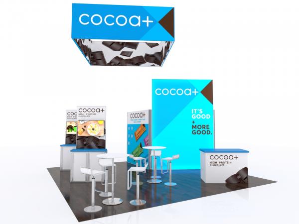 GK-5154 Trade Show Island Exhibit -- Image 1A well-designed trade show island exhibit should be attractive, inviting, informative, and practical. The GK-5154 does all that... and more.  It combines a casual meeting space with a more formal semi-private meeting room. There are two functional workstations with large monitors and locking storage. The design includes a reception counter, also with locking storage. Throughout the island, there are large graphic opportunities at multiple angles to attract attendees from every aisle, including a 12 ft. LED Lightbox. Many of the flat panels are from the patented Gravitee System, which connects without tools or loose parts. The Large Aero Overhead Hanging Sign pulls it all together with internal and external graphics.