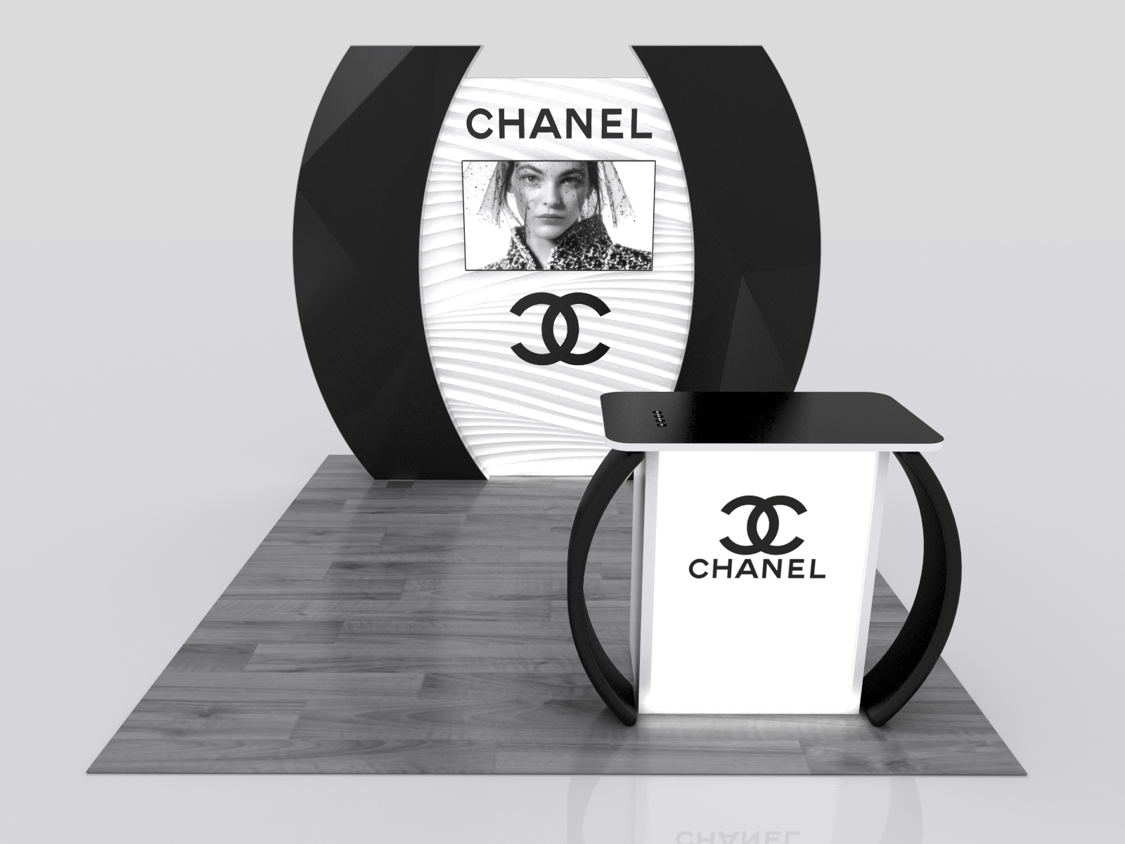 The distinctive VK-1352 and VK-6000 lightboxes blend exceptionally bright LED lights, an aluminum SEG frame, and vibrant fabric graphics into a brilliant eye-catching display. The large LED lightbox spans the display and is framed with curved laminated panels. The middle section supports a large monitor and includes graphics for high impact. Upfront there's a modified MOD-1550 reception counter with a front backlit graphic and USB charging ports. On the far right are two product displays with uplighting for the 20 ft. display. All have integrated cord management. You won't believe your eyes the first time you flip the switch and see how stunning your backlit graphic can be.