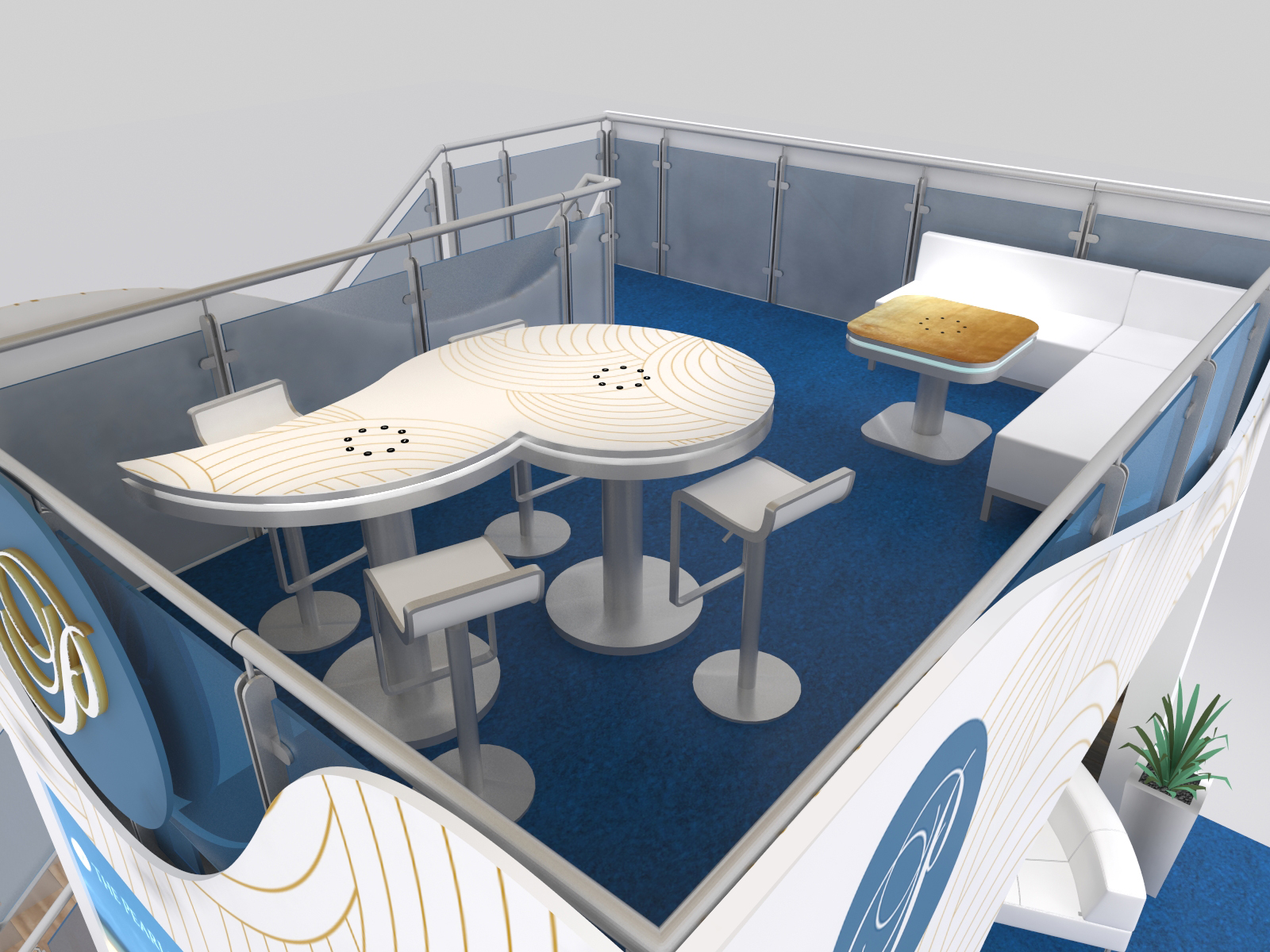 You know from personal experience that a double-deck exhibit always draws a crowd and maximizes your space on the show floor. But it's not enough to just have a double-deck. It must capture your brand and fulfill all your trade show marketing objectives. The VK-5154 wraps a stunning fabric facade around a 4.5 M x 5 M aluminum deck, creating dynamic branding and meeting privacy. It includes multiple casual meeting areas on both the lower and upper floors. All the counters double as charging stations with multiple USB ports for cell phones, tablets, and laptops. There's even a captivating two-sided lightbox and convenient iPad Swivel stand.
