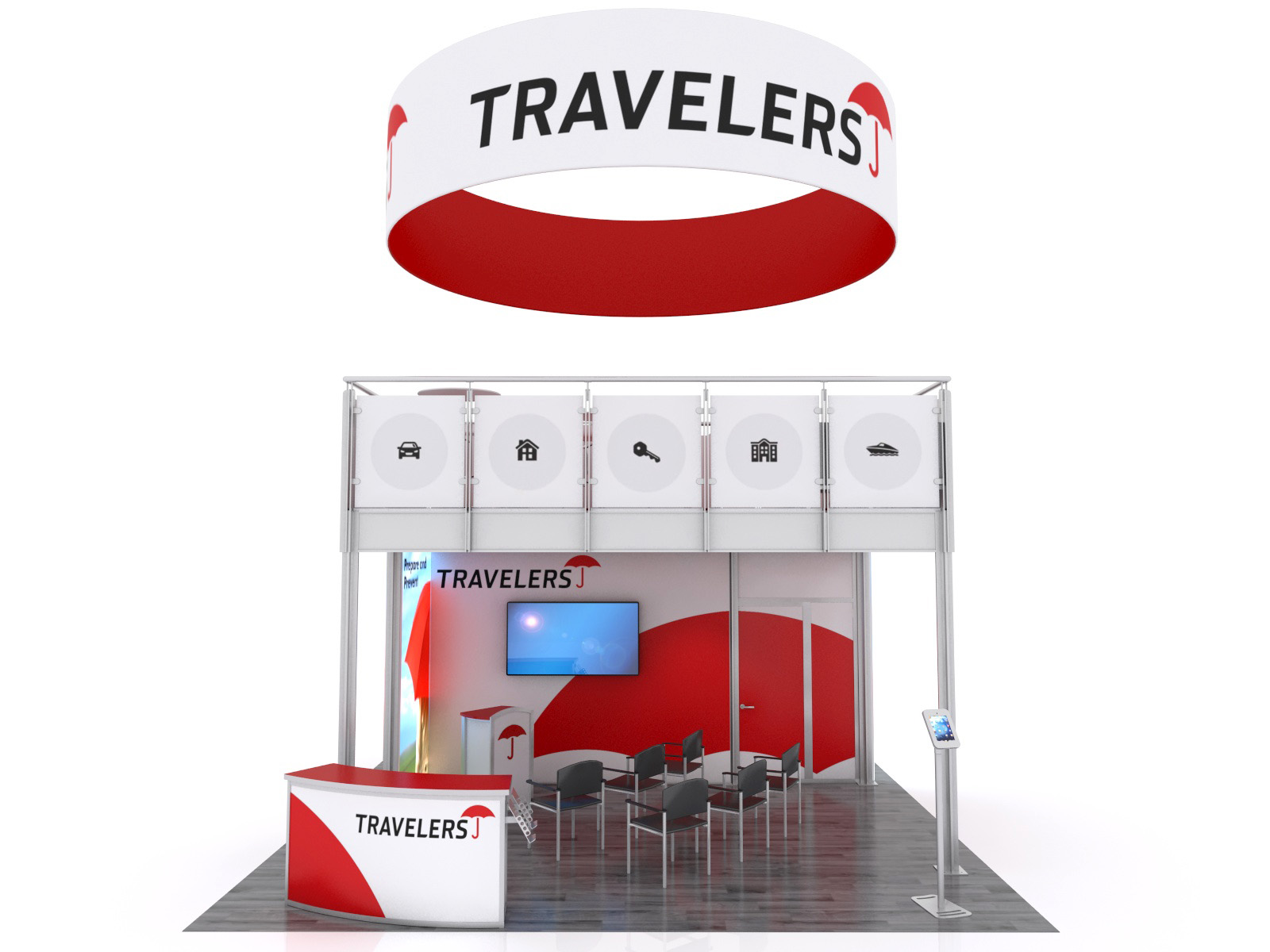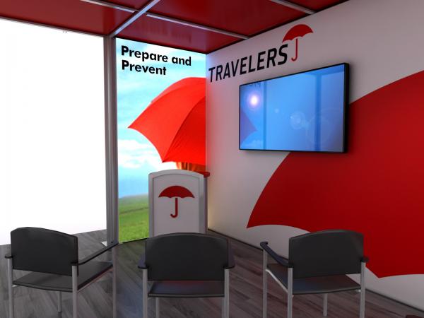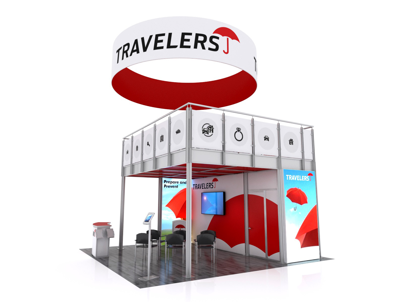 You've seen other exhibitors with double-decks. You've seen the crowds they attract and how a double-deck maximizes their trade show footprint. The VK-5156 is designed to transform a typical 20 x 20 space into an effective presentation area while encouraging face-to-face interaction between your team and potential clients. There's a reception counter with storage, a podium, and an iPad kiosk for attendees who want to learn more about your products or services. For larger and more private meetings, the upper deck is large enough for multiple groups and includes a charging table for your phone or tablet.