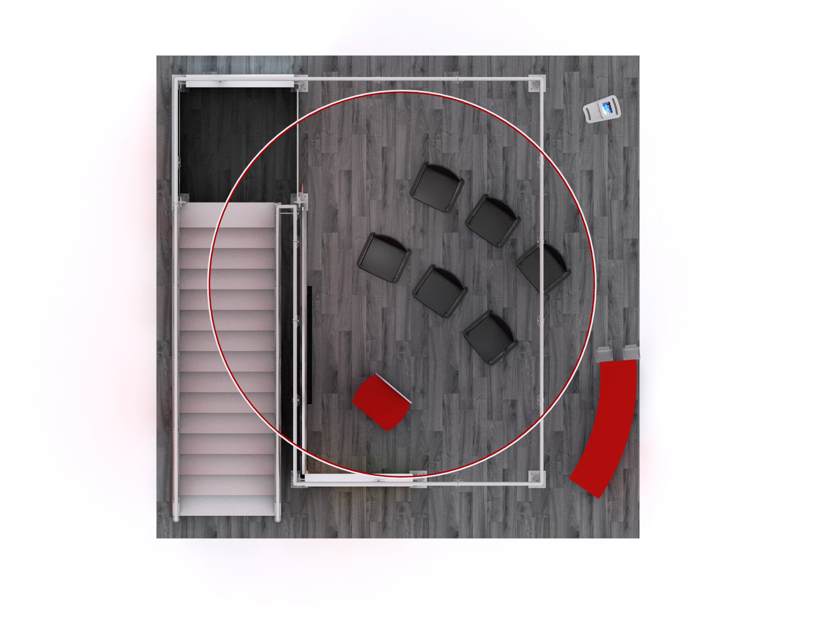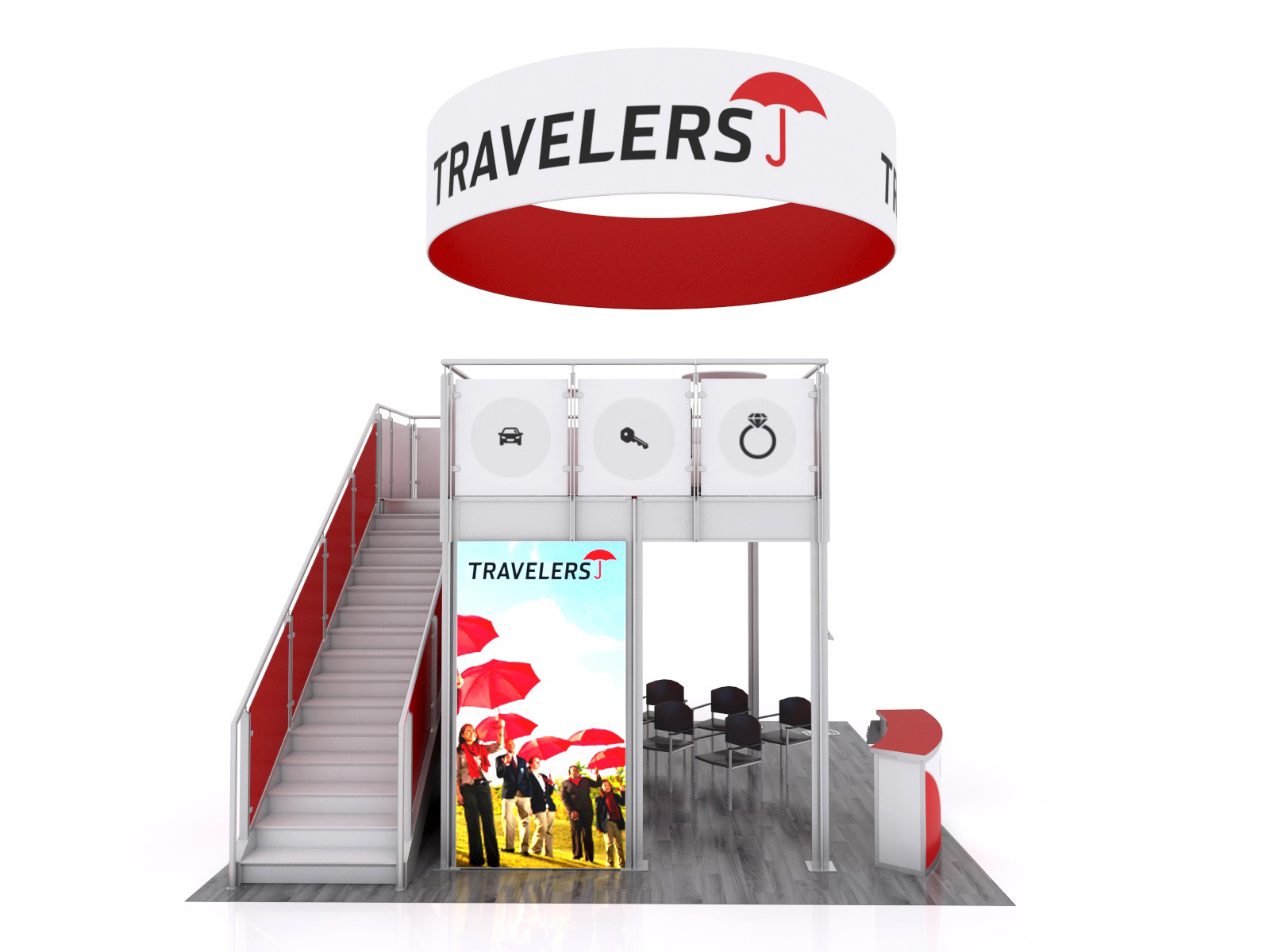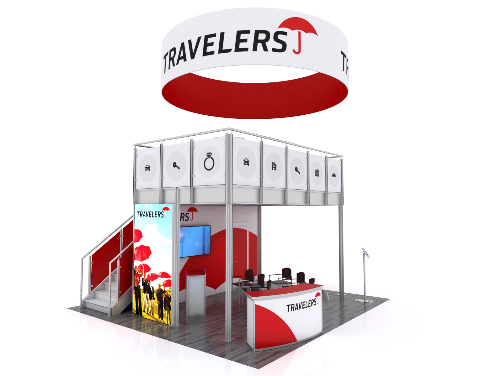 You've seen other exhibitors with double-decks. You've seen the crowds they attract and how a double-deck maximizes their trade show footprint. The VK-5156 is designed to transform a typical 20 x 20 space into an effective presentation area while encouraging face-to-face interaction between your team and potential clients. There's a reception counter with storage, a podium, and an iPad kiosk for attendees who want to learn more about your products or services. For larger and more private meetings, the upper deck is large enough for multiple groups and includes a charging table for your phone or tablet.