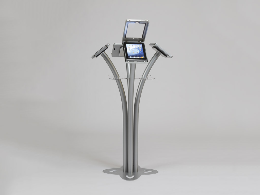 The Port Land iPad Kiosks™ are anything but dull. They are innovative, lightweight, and affordable. The locking clamshell frame rotates with the unique Swivel Stop™ feature, allowing you to seamlessly reposition your iPad to Portrait or Landscape mode. The kiosks are made from durable engineered aluminum and assembly in minutes. There are multiple single iPad kiosks. The MOD-1334 is designed for two iPads and the MOD-1338 for four iPads. All have integrated cord management.
