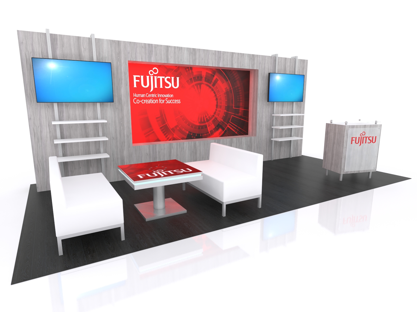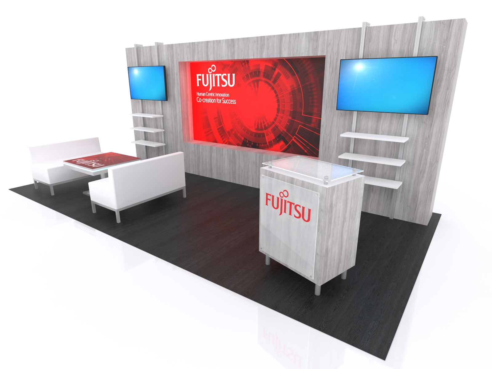 The VK-4017 strikes the ideal balance between an upscale, minimalist design and modern, functional tradeshow "must haves," such as shelving, monitors, and storage. The custom backwall includes a large inset SuperNova LED Lightbox with fabric graphics (111" x 58"). The lightbox is framed by two monitors and adjustable shelving. There's a casual seating area with an MOD-1434 charging coffee table. The matching MOD-1161 reception counter includes locking storage and a large graphic facade.