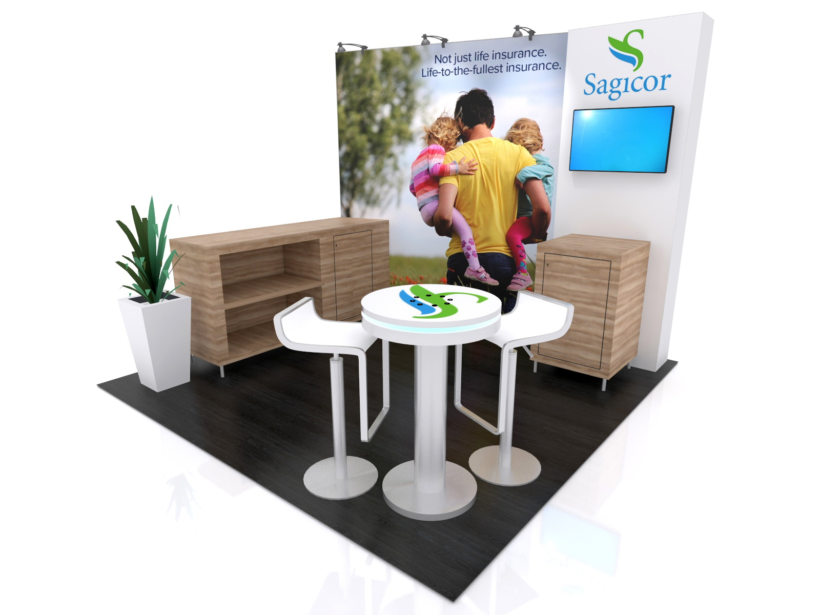 You paid for the exhibit space. Maximize it. The GK-1010 utilizes the full 10 x 10 space starting with large format graphics on easy to assemble Gravitee Modular Frames (no tools or loose parts). The design features a monitor mount for video presentations, locking storage for personal items and promotional giveaways, and convenient shelves for brochures and product demos. Best of all, there's the MOD-1442 Bistro Charging Table. It's perfect for meeting with show attendees, who can charge their phone or tablet while hearing about your products and services. The GK-1010 assembles quickly and ships in a fabric-lined, jigged crate with customized packaging.