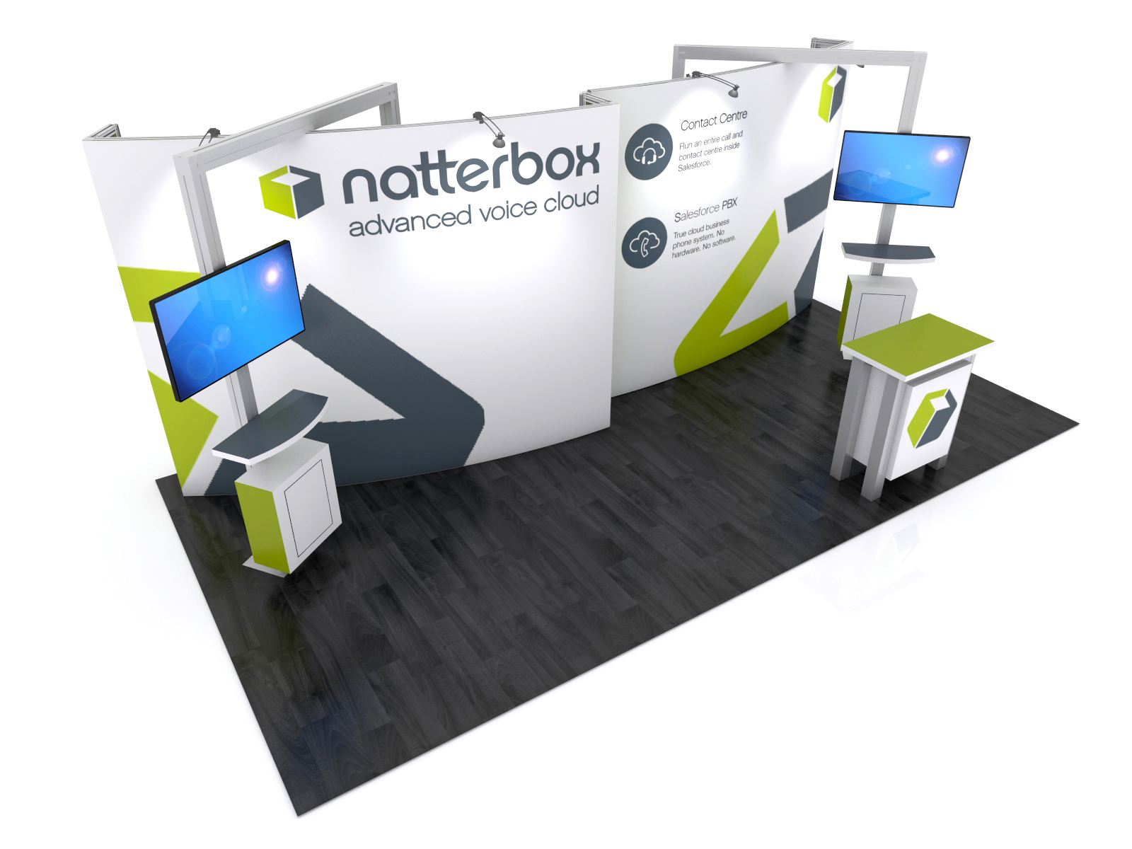 Most modern exhibitors have four basic requests: large graphics, interactive workspaces, modular assembly, and re-configurable designs. The GK-1011 series meets all those requirements. The Gravitee One-Step Modular Walls allow for seamless fabric or direct print graphics in a 10, 20 and 30 ft. inline space. The custom workstations are not only practical with a large monitor and locking storage, but also a stylish free-floating addition to the overall design. All three versions include the MOD-1158 reception counter with standoff graphics and locking storage. The backwall assembles quickly and the remaining components can be either fully assembled or partially assembled for modular packaging.
